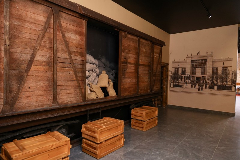 Ұлы Отан соғысы кезеңіне арналған бөлімде майданға жүк тасымалдауды бейнелейтін теміржол вагоны