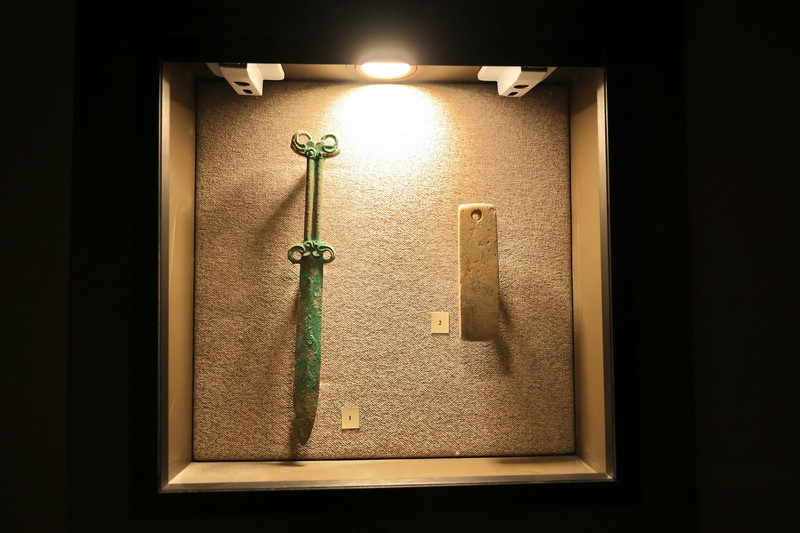 сондай-ақ Ақтоғай ауданындағы Қарабиі қорымынан табылған, сабы арқар мүйізі мен жыртқыш құстар бейнесімен өрнектелген қос жүзді акинак қанжары бар.