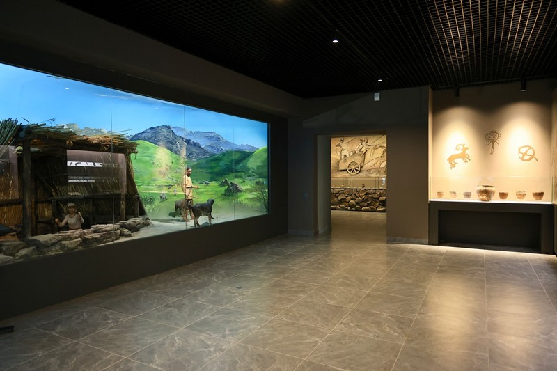 Диорамалар көне дәуірдегі тіршілік көріністерін шынайы бейнелейді: қола дәуірінің баспанасы, қызған пеш маңындағы металлургтер шеберханасы және басқа да сахналар.