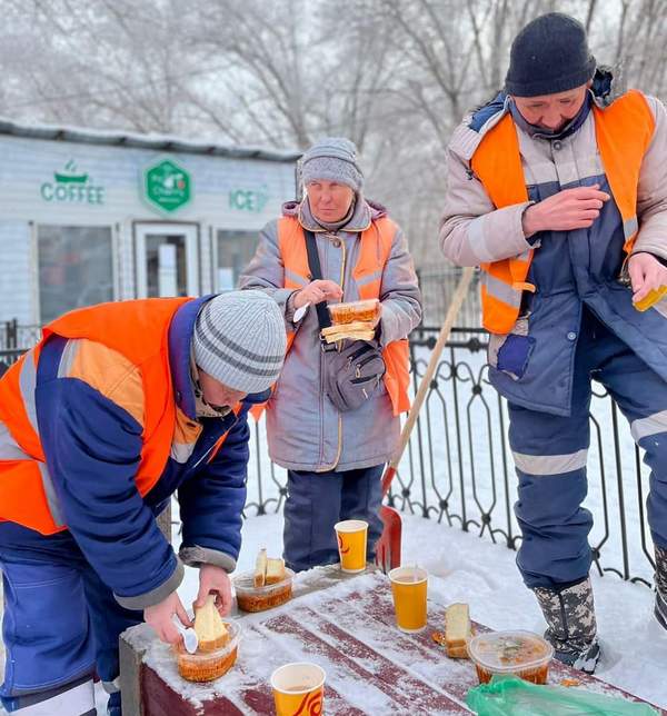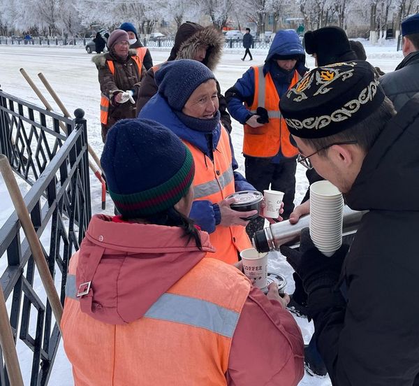 В Жезказгане общественники, волонтёры и неравнодушные жители запустили необычный челлендж. Они обеспечивают горячим чаем и питанием работников коммунальных служб, которые занимаются уборкой снега на улицах города.