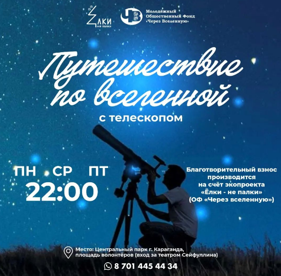 Молодёжный общественный фонд «Через Вселенную» приглашает жителей и гостей Караганды на бесплатные познавательно-развлекательные мероприятия. Все они будут проходить в Центральном парке, на площади рядом с берёзовой аллеей.