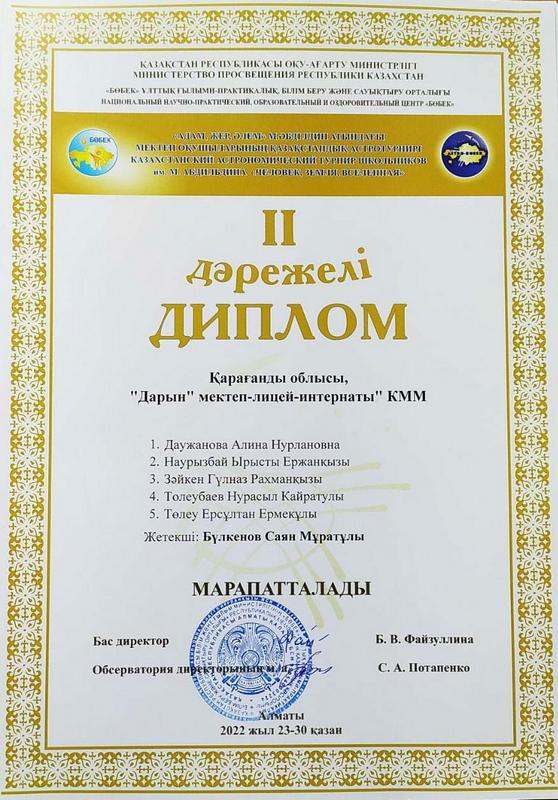 Қарағанды облысының командасы Мейірхан Әбділдин атындағы оқушылар арасында республикалық астротурнирде екінші орын алды. «Адам, Жер, Ғалам» зияткерлік жарысы Алматыдағы «Бөбек» Ұлттық ғылыми-практикалық, білім беру және сауықтыру орталығының обсерваториясының базасында өтті.