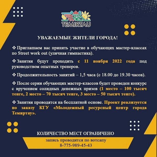 Молодёжный ресурсный центр города Темиртау приглашает всех желающих принять участие в бесплатных мастер-классах по Street Workout. Основным элементам уличной гимнастики будут учить опытные тренеры в специально оборудованном крытом зале.