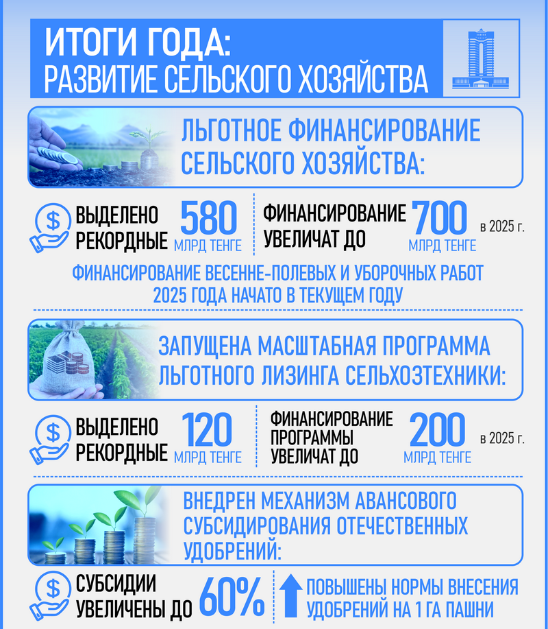 В текущем году были созданы все необходимые условия для успешного проведения весенних полевых и уборочных работ. Во исполнение поручений Главы государства обеспечивается доступность финансирования АПК. Объём льготного финансирования отрасли впервые составил рекордные 580 млрд тенге, которые были направлены аграриям на прямое кредитование, удешевление процентной ставки и форвардную закупку. В 2025 году сумма достигнет 700 млрд тенге. Благоприятные погодные условия осени позволили провести уборочную кампанию практически без значительных потерь, несмотря на осадки во время сбора урожая.