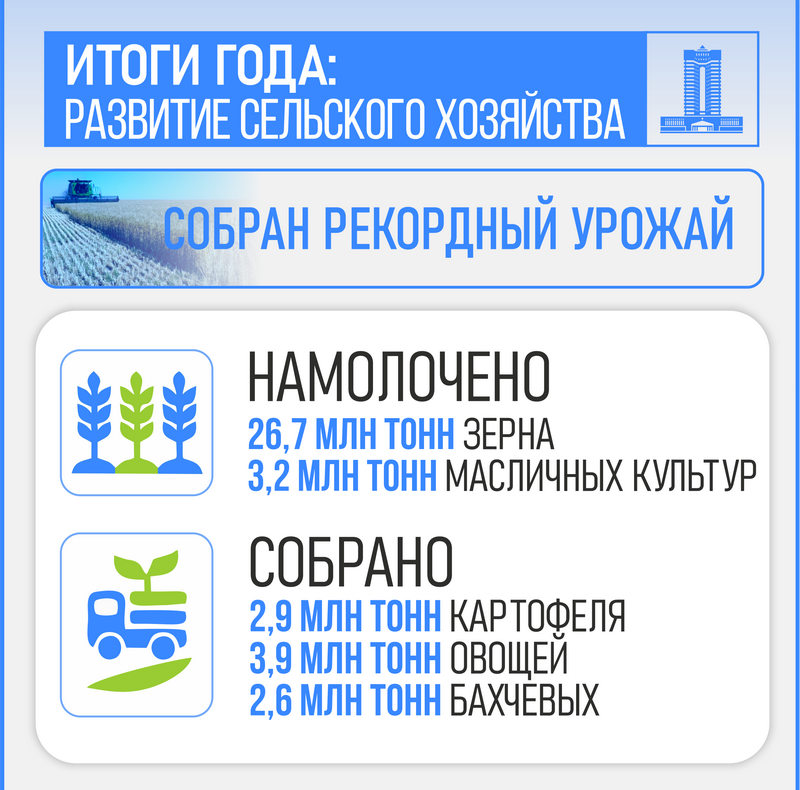 Как результат, аграриями республики был собран рекордный урожай зерновых культур — при средней урожайности 16,1 ц/га намолочено 26,7 млн тонн зерна. Для сравнения в 2023 году средняя урожайность составила 10 ц/га. Также намолочено 3,2 млн тонн масличных культур с урожайностью 10,9 ц/га, собрано 2,9 млн тонн картофеля, 3,9 млн тонн овощей и 2,6 млн тонн бахчевых. Высокая урожайность была достигнута в том числе благодаря правильному применению агротехнологий, качественным семенам, минеральным удобрениям и эффективной защите растений.