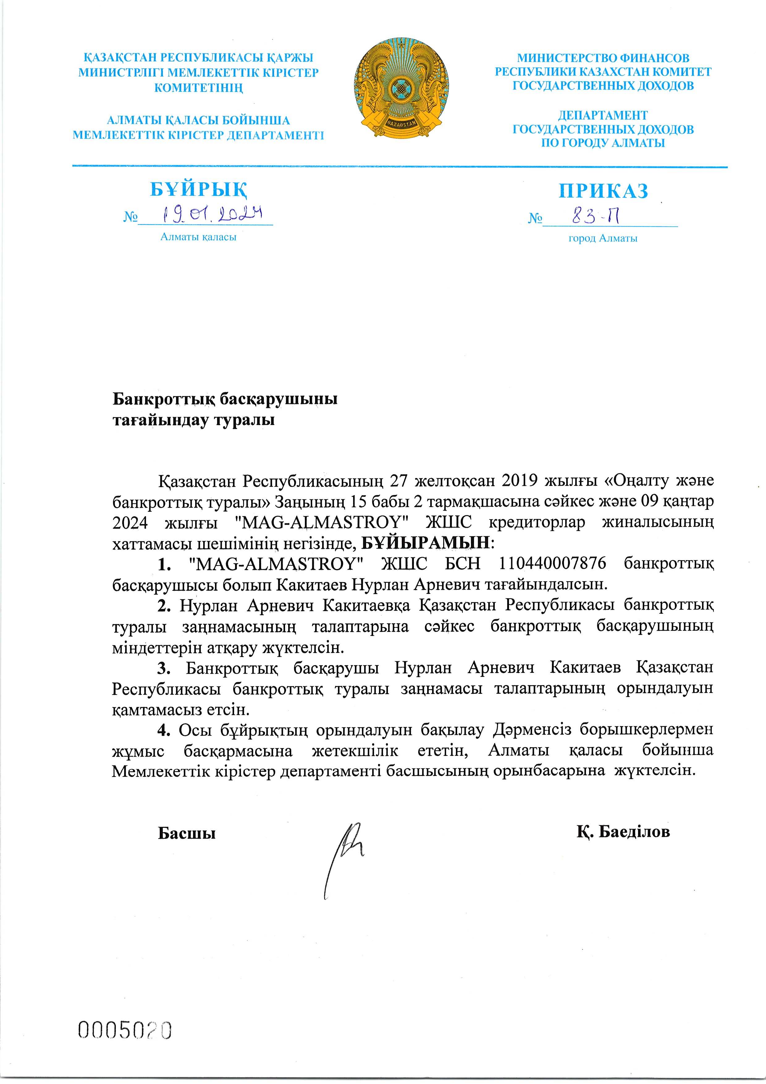 "MAG-ALMASTROY" ЖШС банкроттық басқарушыны тағыайындау туралы бұйрық