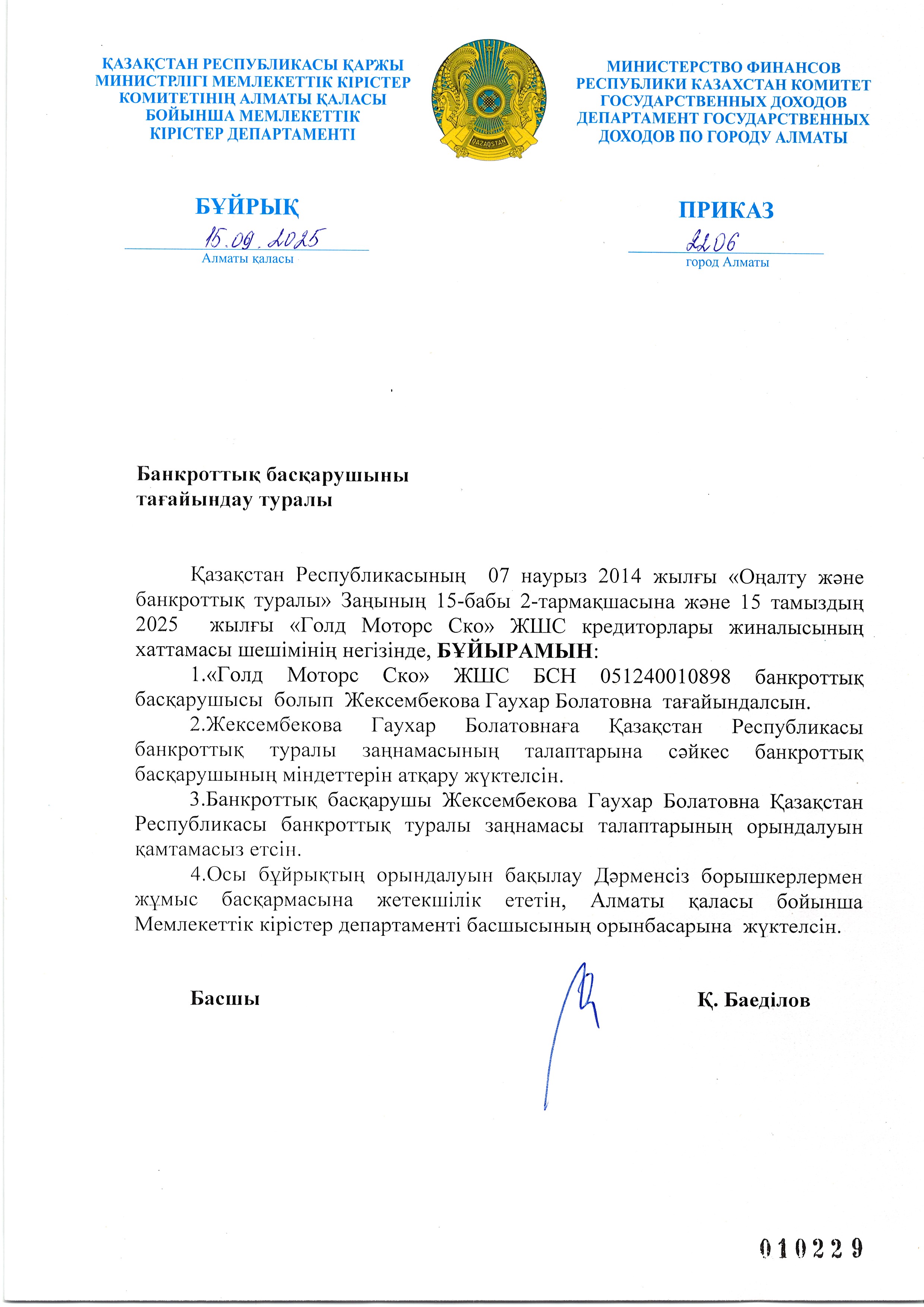 «Голд Моторс Ско» ЖШС банкроттық басқарушыны тағайындау туралы бұйрық