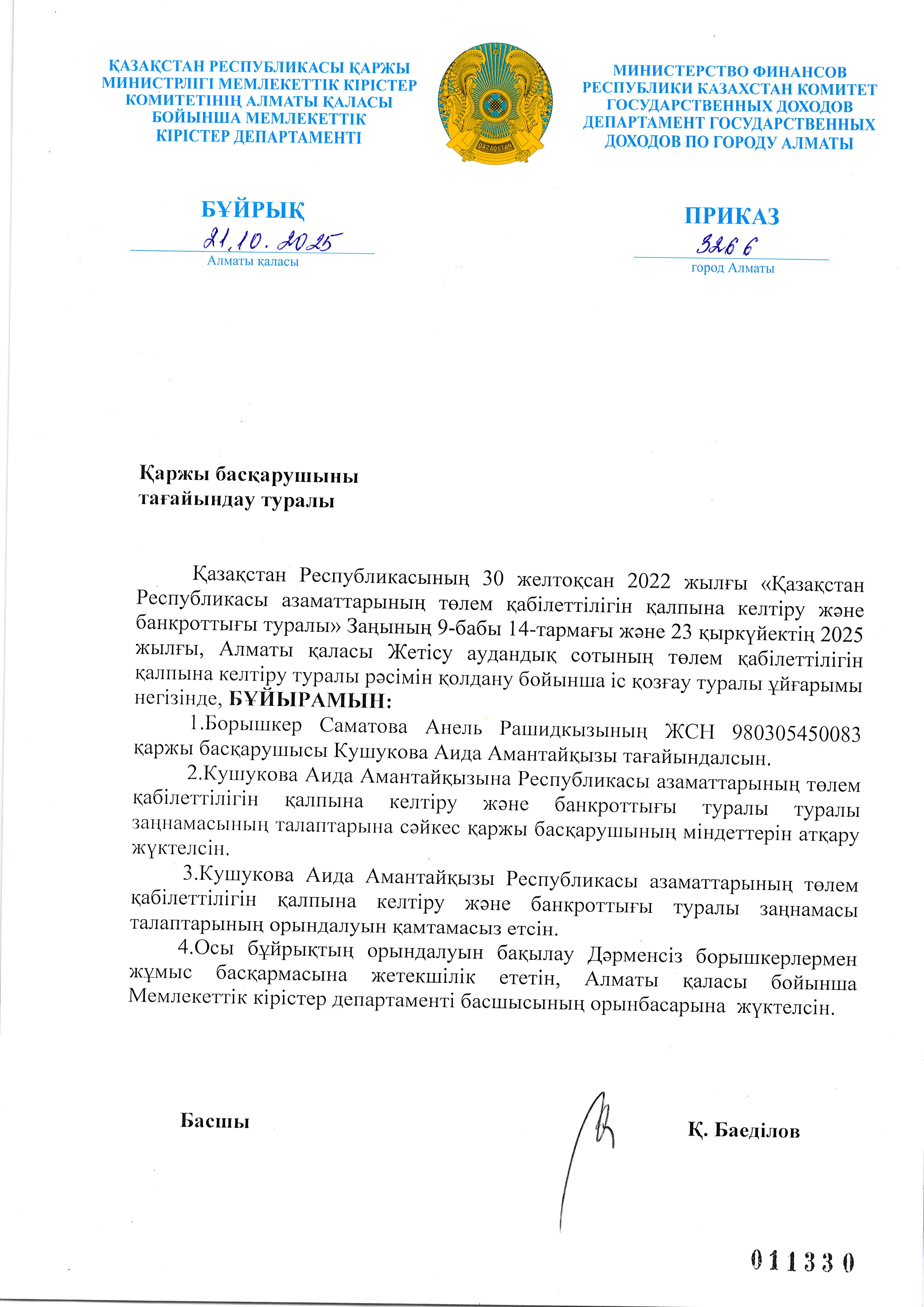 Саматова Анель Рашидқызының арызы бойынша қаржы басқарушыны тағайындау туралы бұйрық