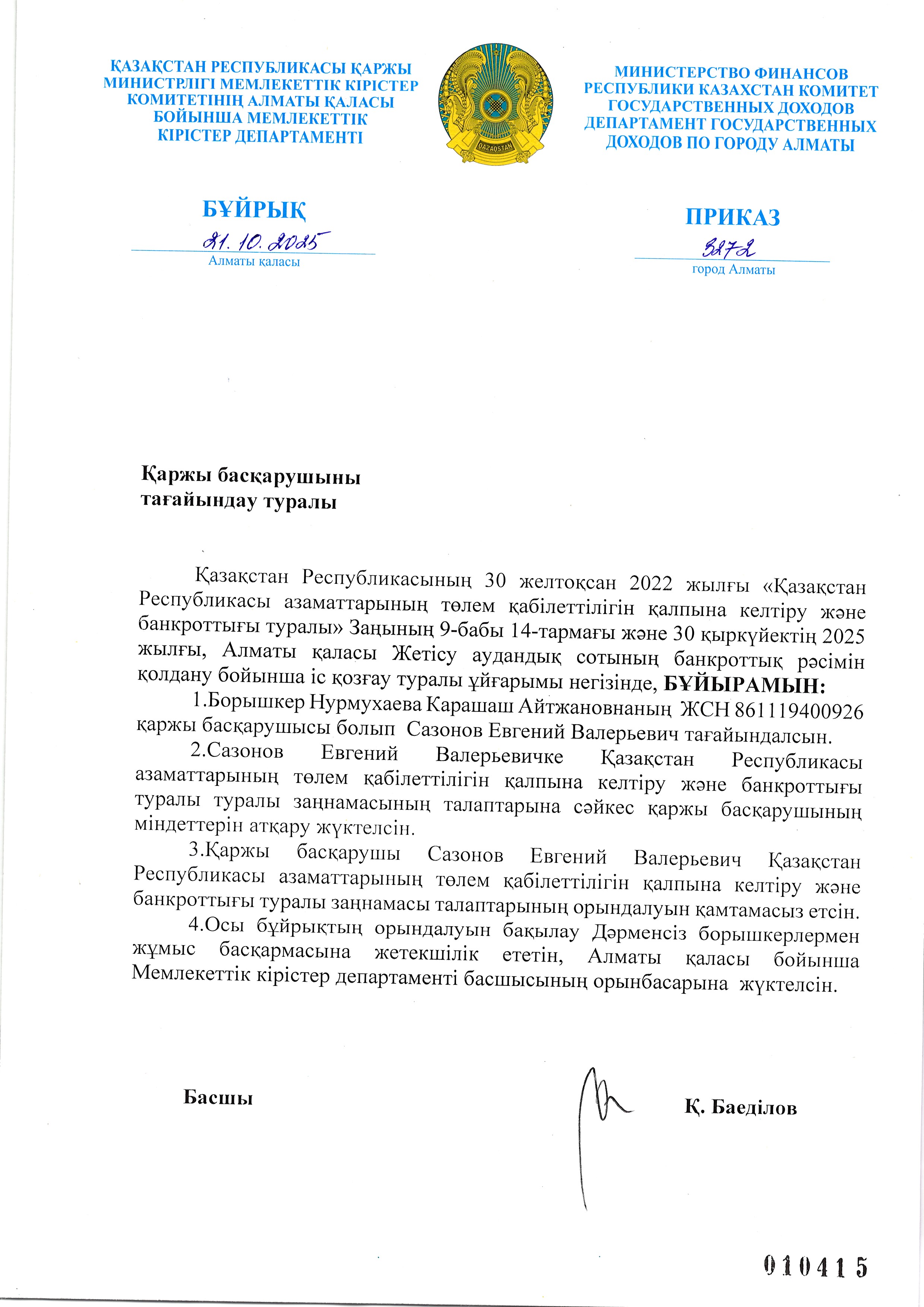 Нурмухаева Карашаш Айтжановнаның арызы бойынша қаржы басқарушыны тағайындау туралы бұйрық