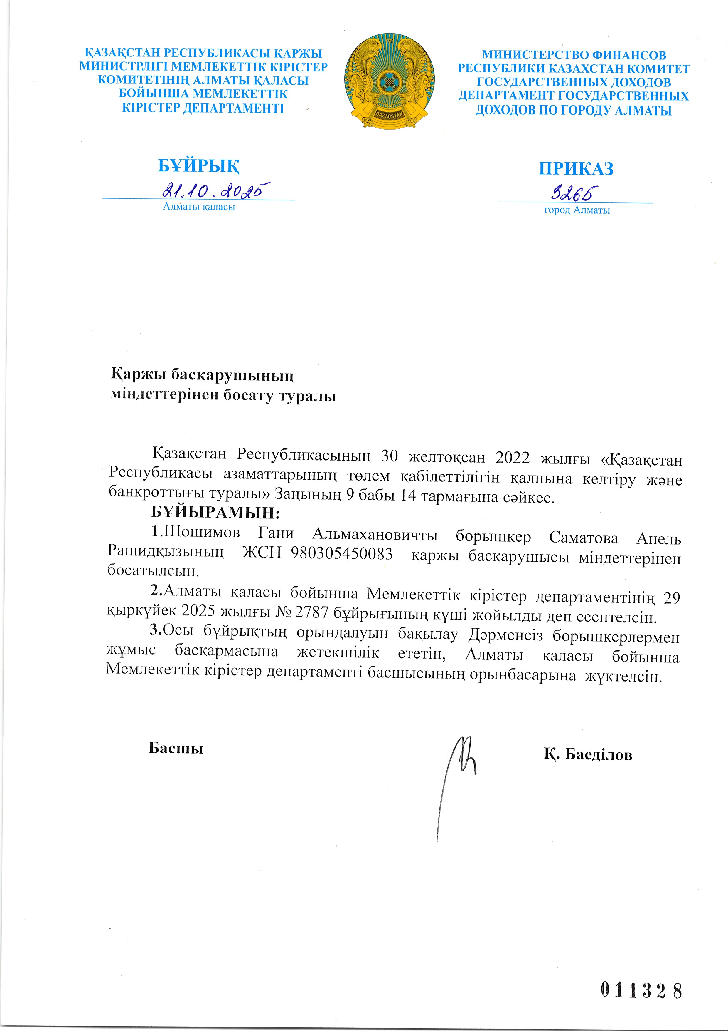 Саматова Анель Рашидқызының қаржы басқарушының міндеттерінен босату туралы бұйырық