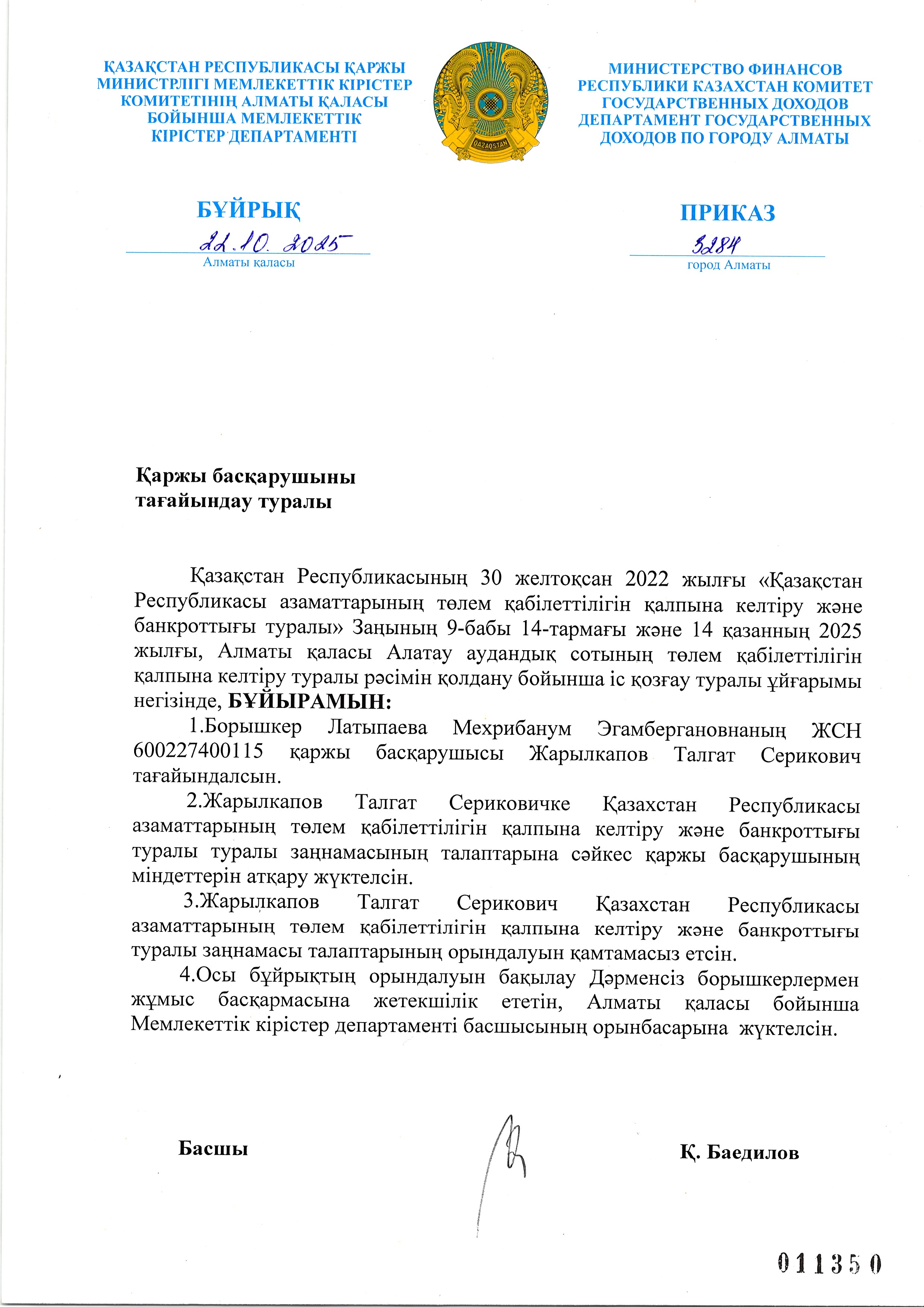 Латыпаева Мехрибанум Эгамбергановнаның арызы бойынша қаржы басқарушыны тағайындау туралы бұйрық