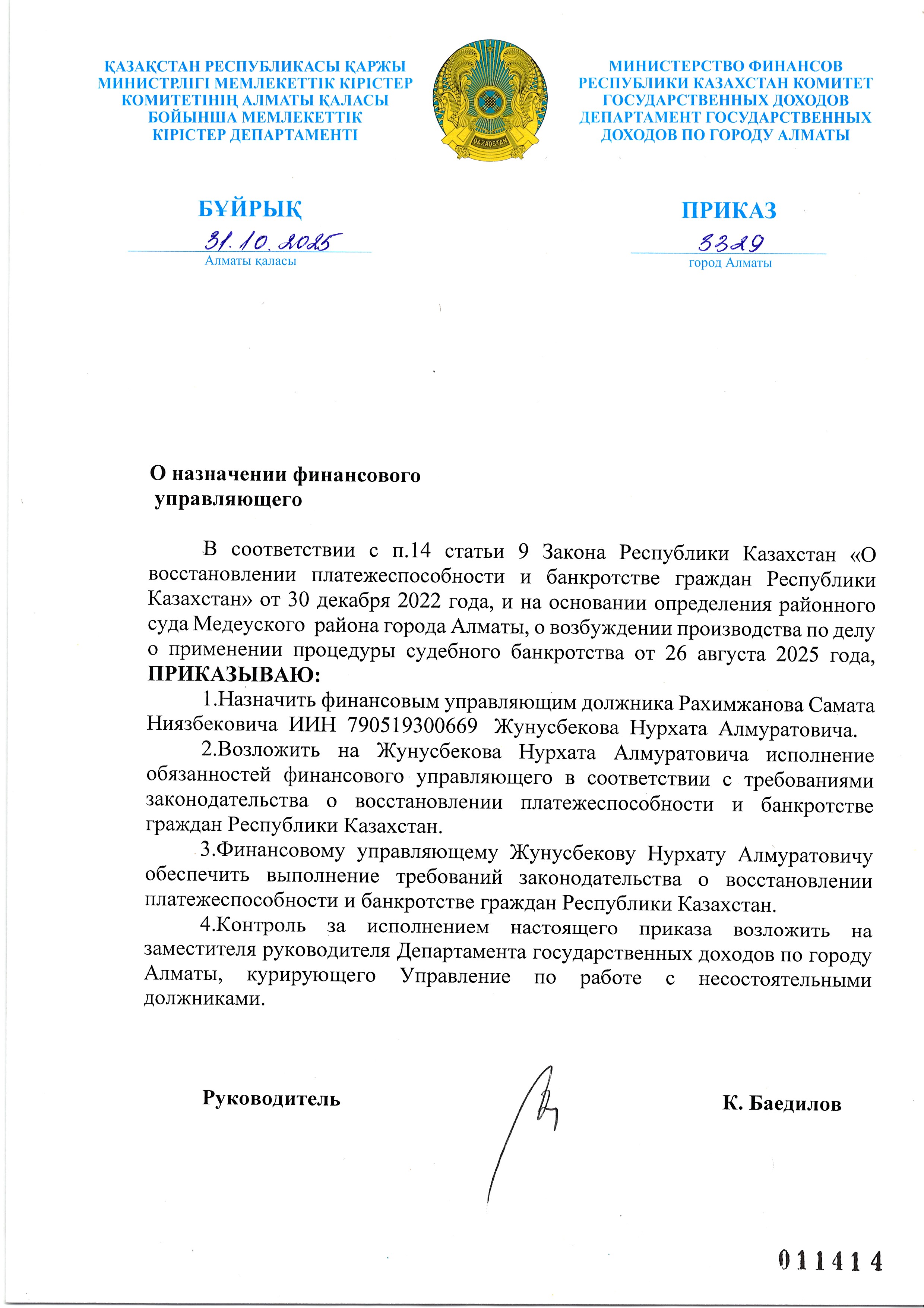 Рахимжанов Самат арызы бойынша қаржы басқарушыны тағайындау туралы бұйрық