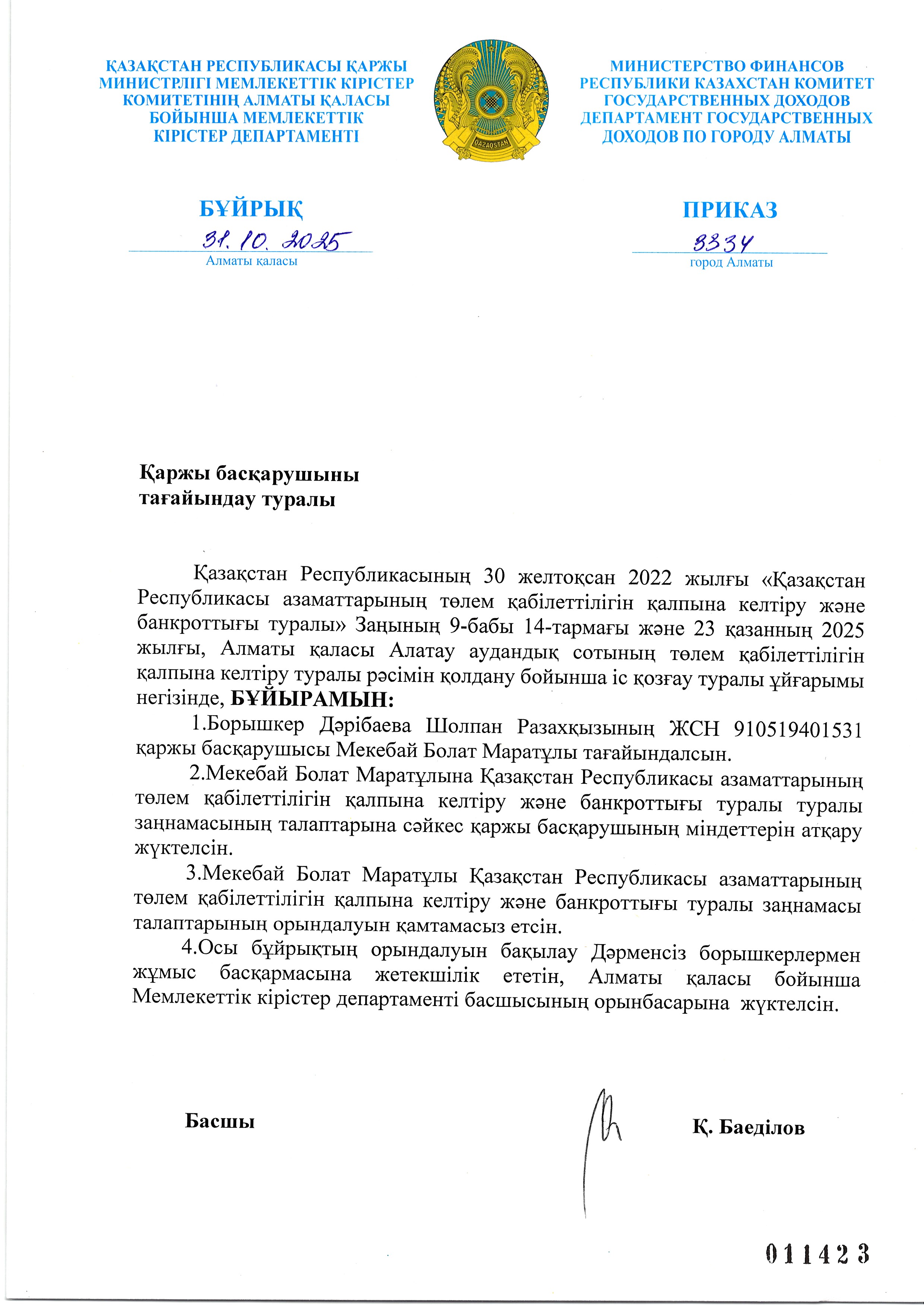 Дәрібаева Шолпан арызы бойынша қаржы басқарушыны тағайындау туралы бұйрық