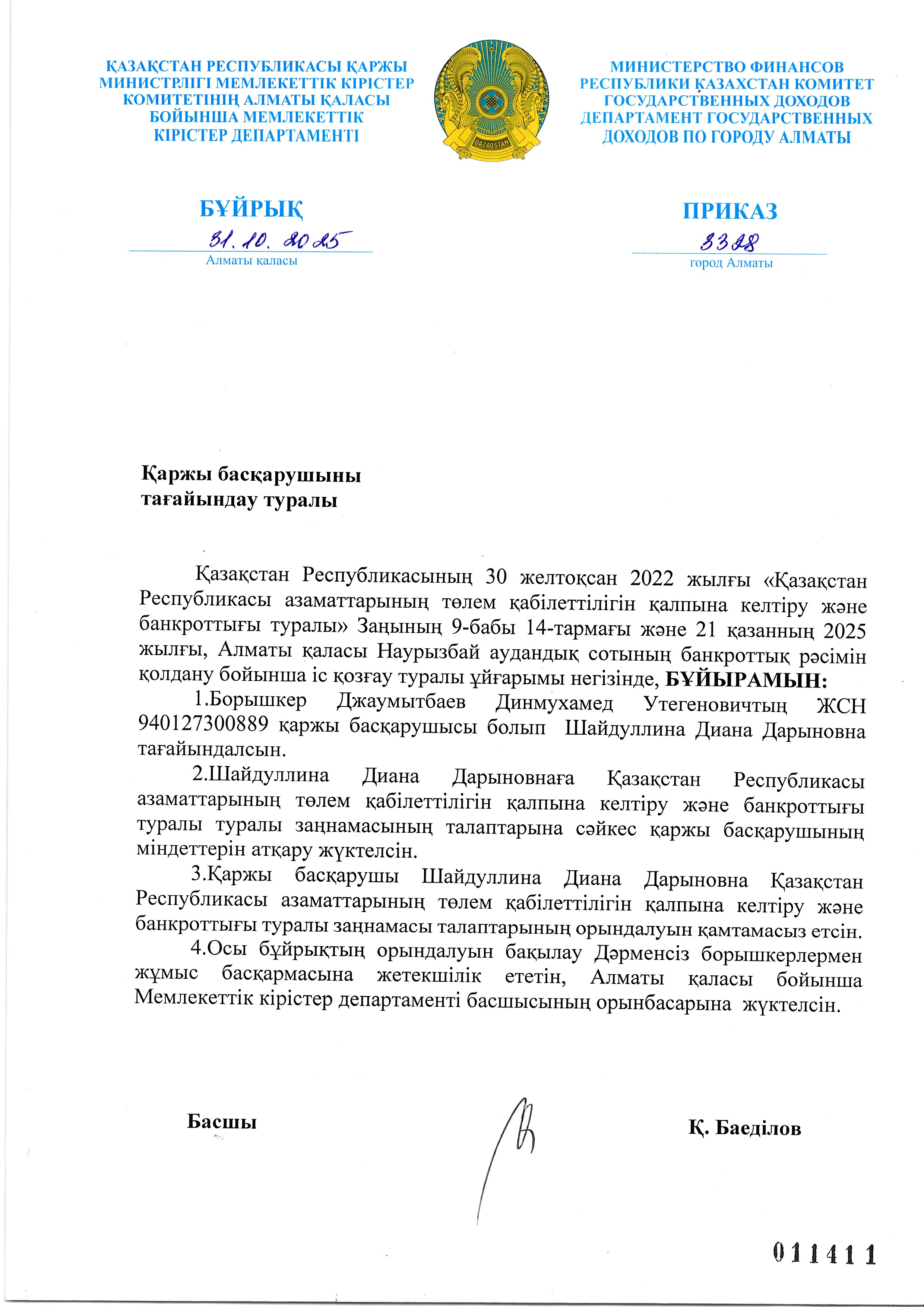 Джаумытбаев Динмухамед арызы бойынша қаржы басқарушыны тағайындау туралы бұйрық