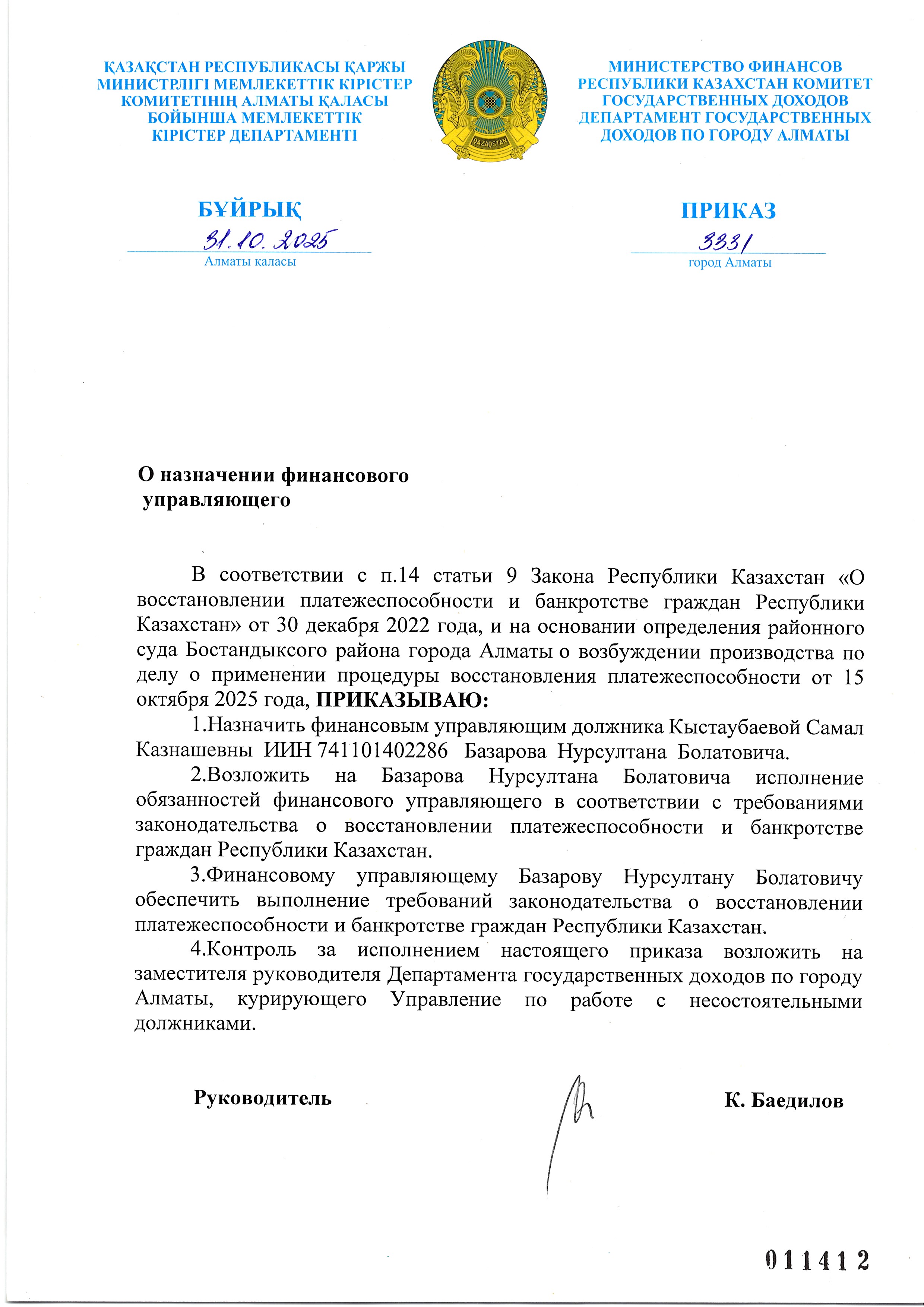 Кыстаубаева Самал арызы бойынша қаржы басқарушыны тағайындау туралы бұйрық