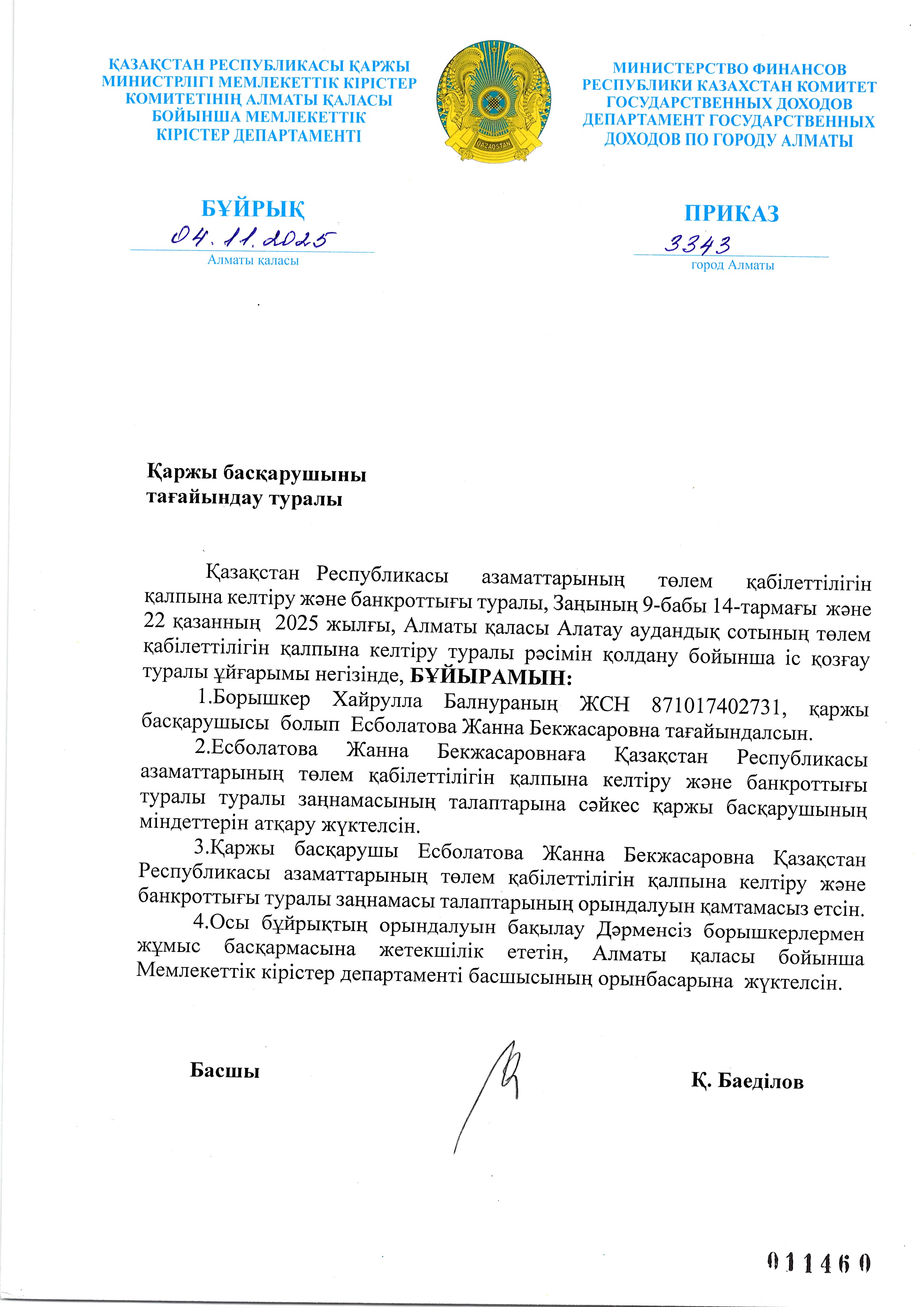 Хайрулла Балнураның арызы бойынша қаржы басқарушыны тағайындау туралы бұйрық