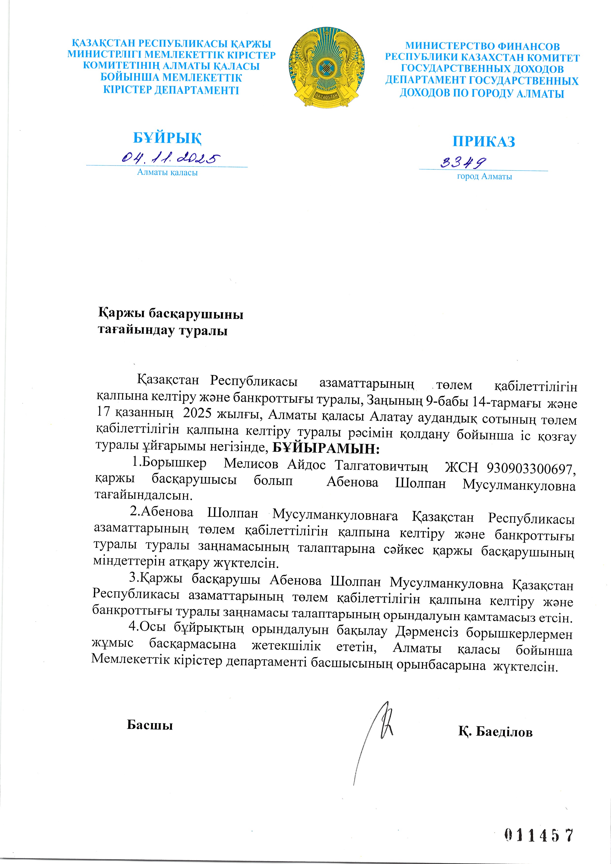 Мелисов Айдостың арызы бойынша қаржы басқарушыны тағайындау туралы бұйрық