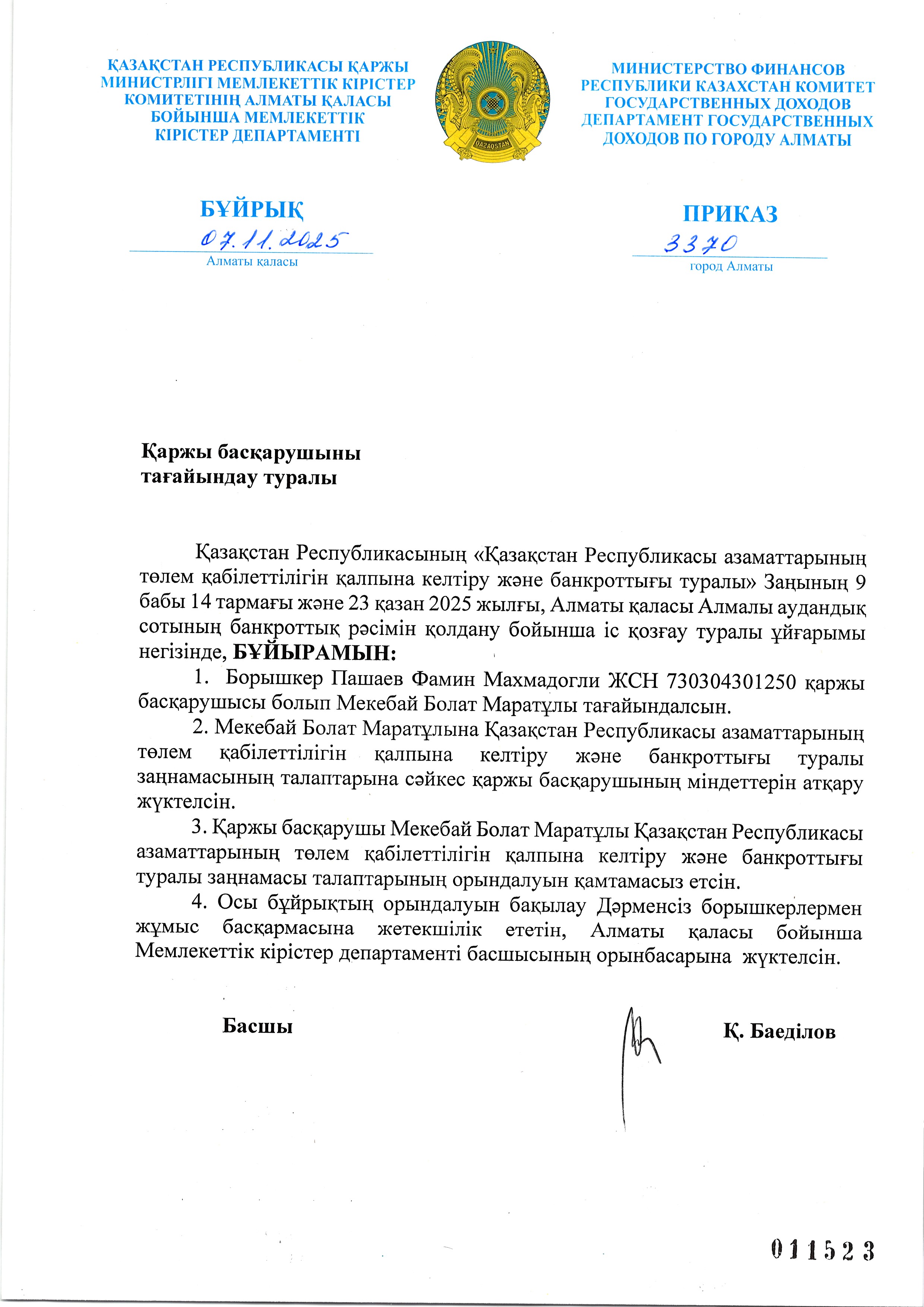 Пашаев Фамин Махмадогли арызы бойынша қаржы басқарушыны тағайындау туралы бұйрық