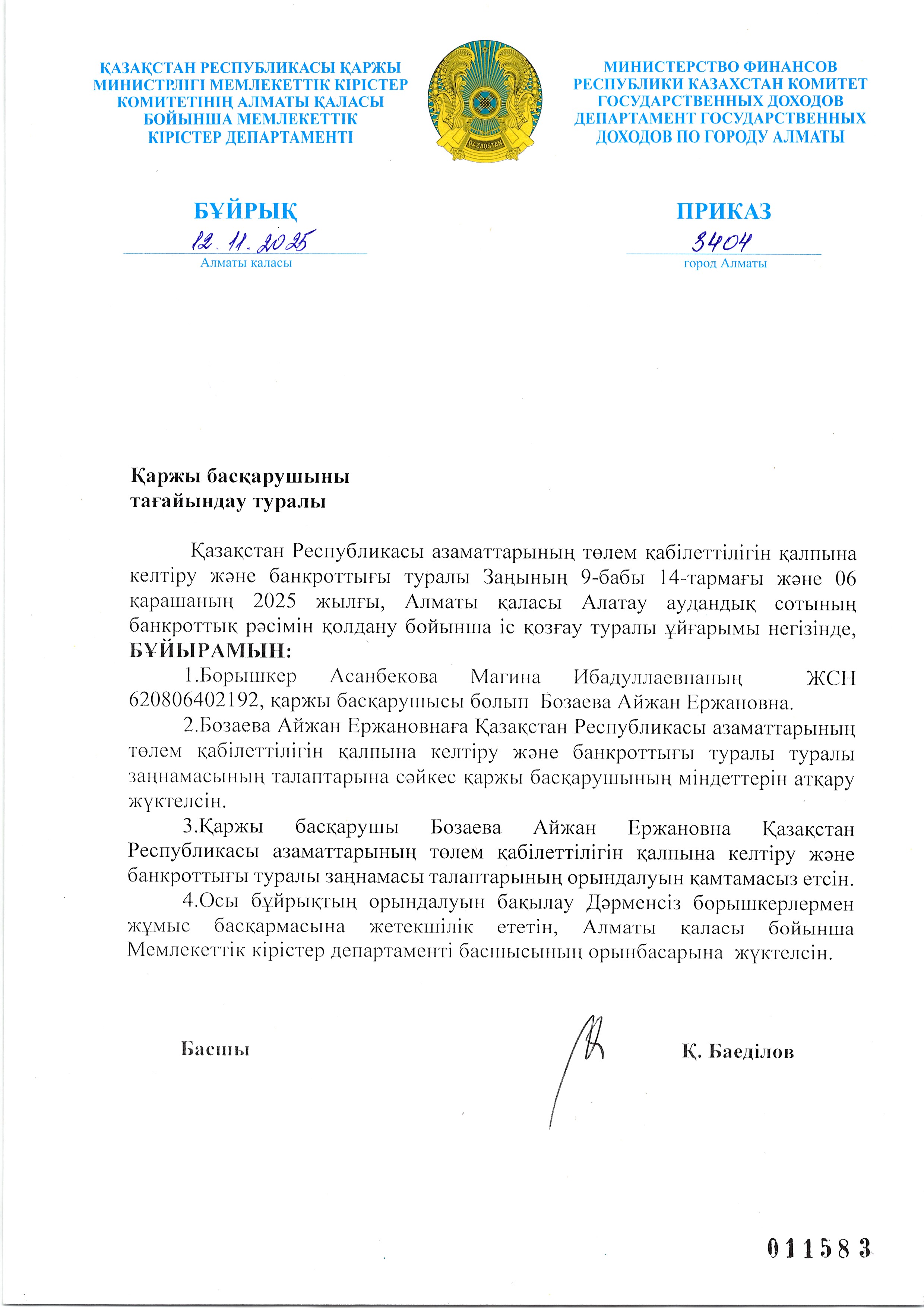 Асанбекова Магинаның арызы бойынша қаржы басқарушыны тағайындау туралы бұйрық