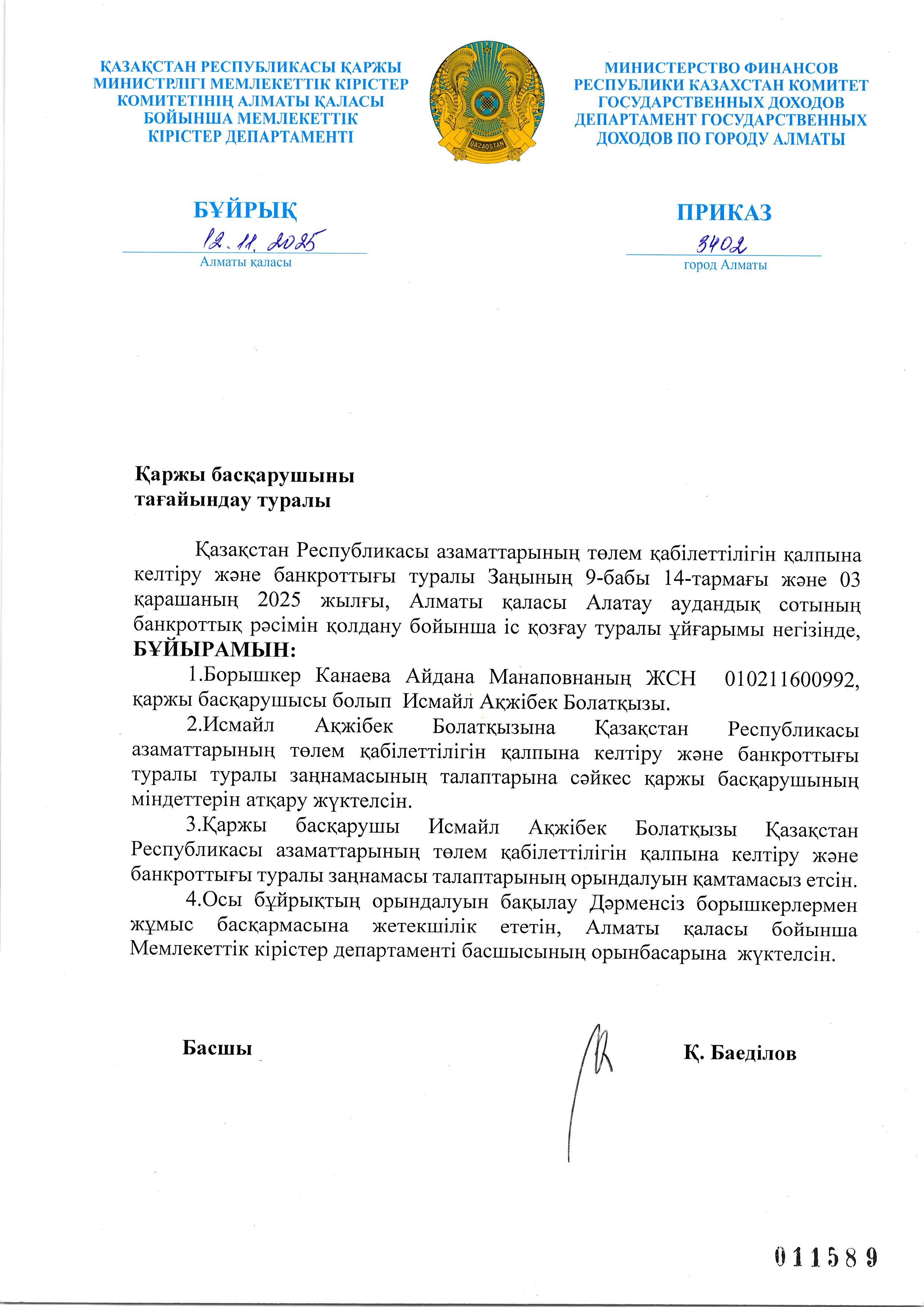 Канаева Айдананың арызы бойынша қаржы басқарушыны тағайындау туралы бұйрық
