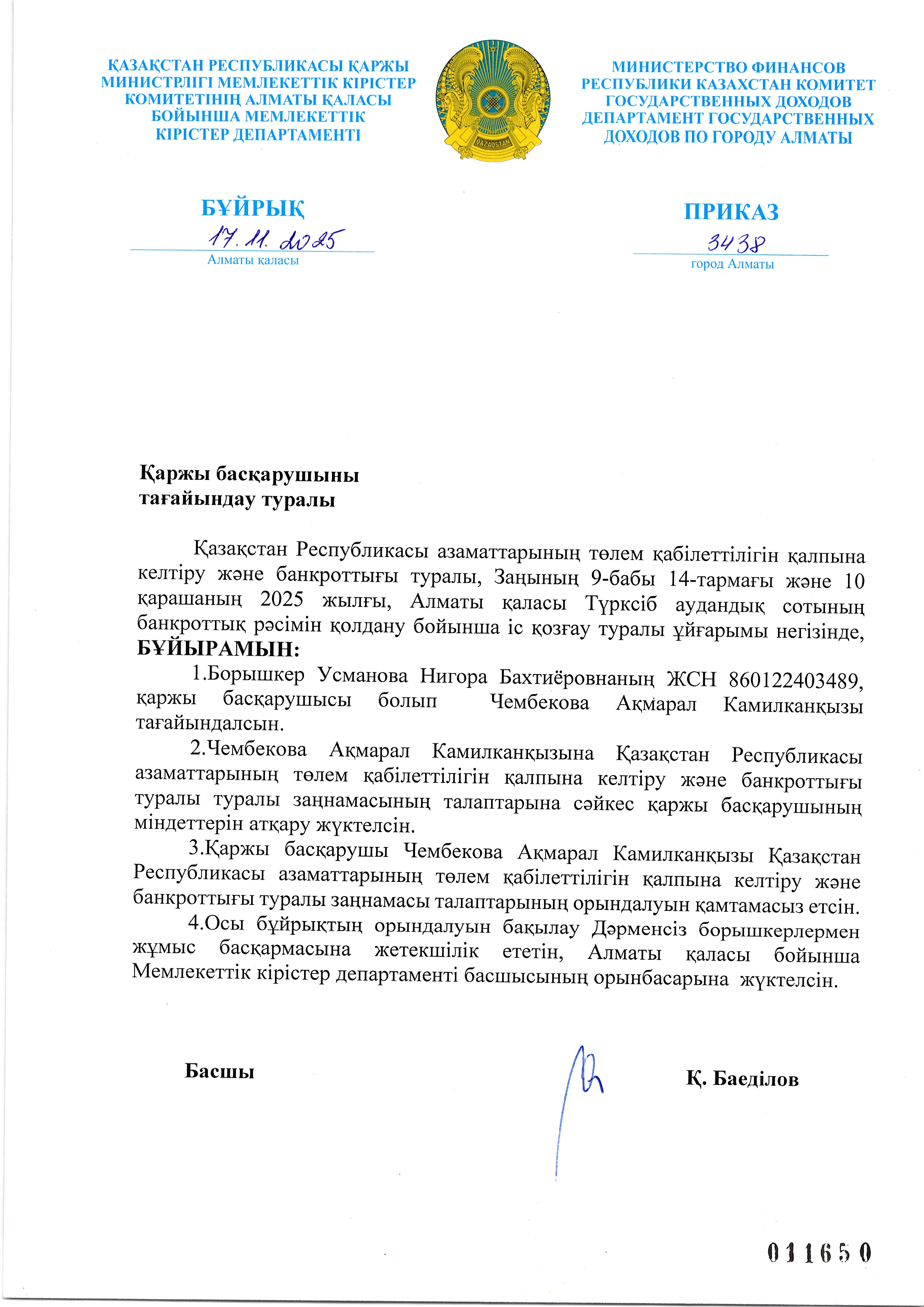 Усманова Нигора Бахтиёровның арызы бойынша қаржы басқарушыны тағайындау туралы бұйрық