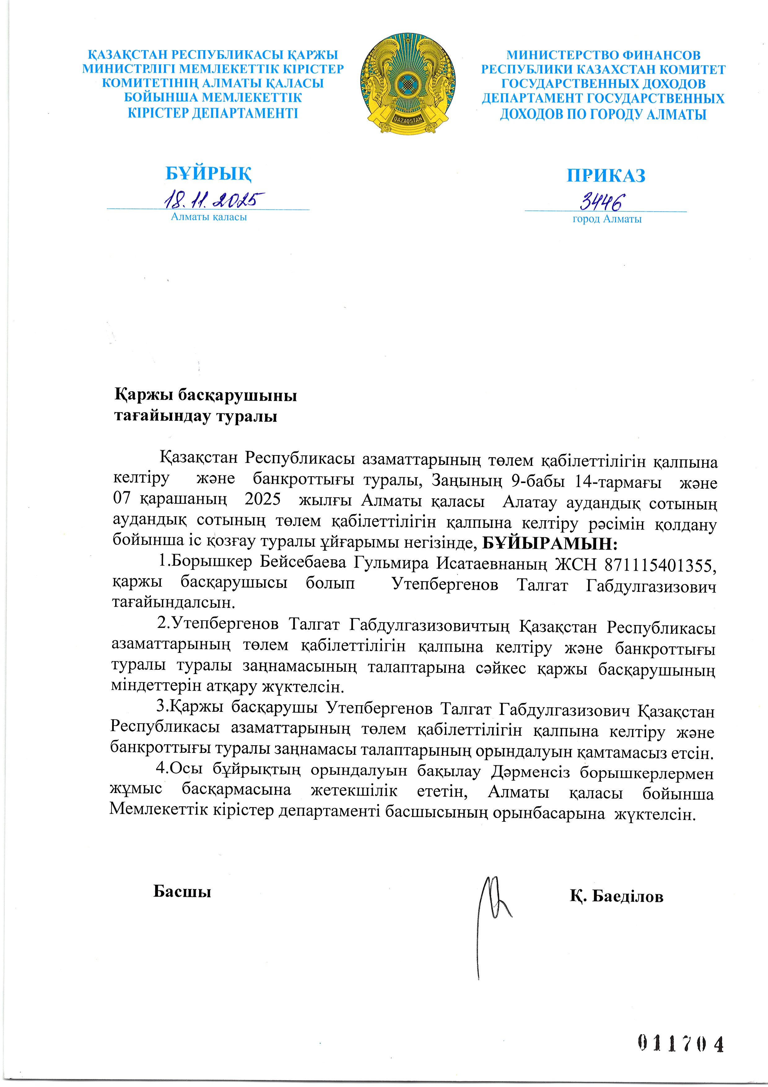 Бейсебаева Гульмираның арызы бойынша қаржы басқарушыны тағайындау туралы бұйрық