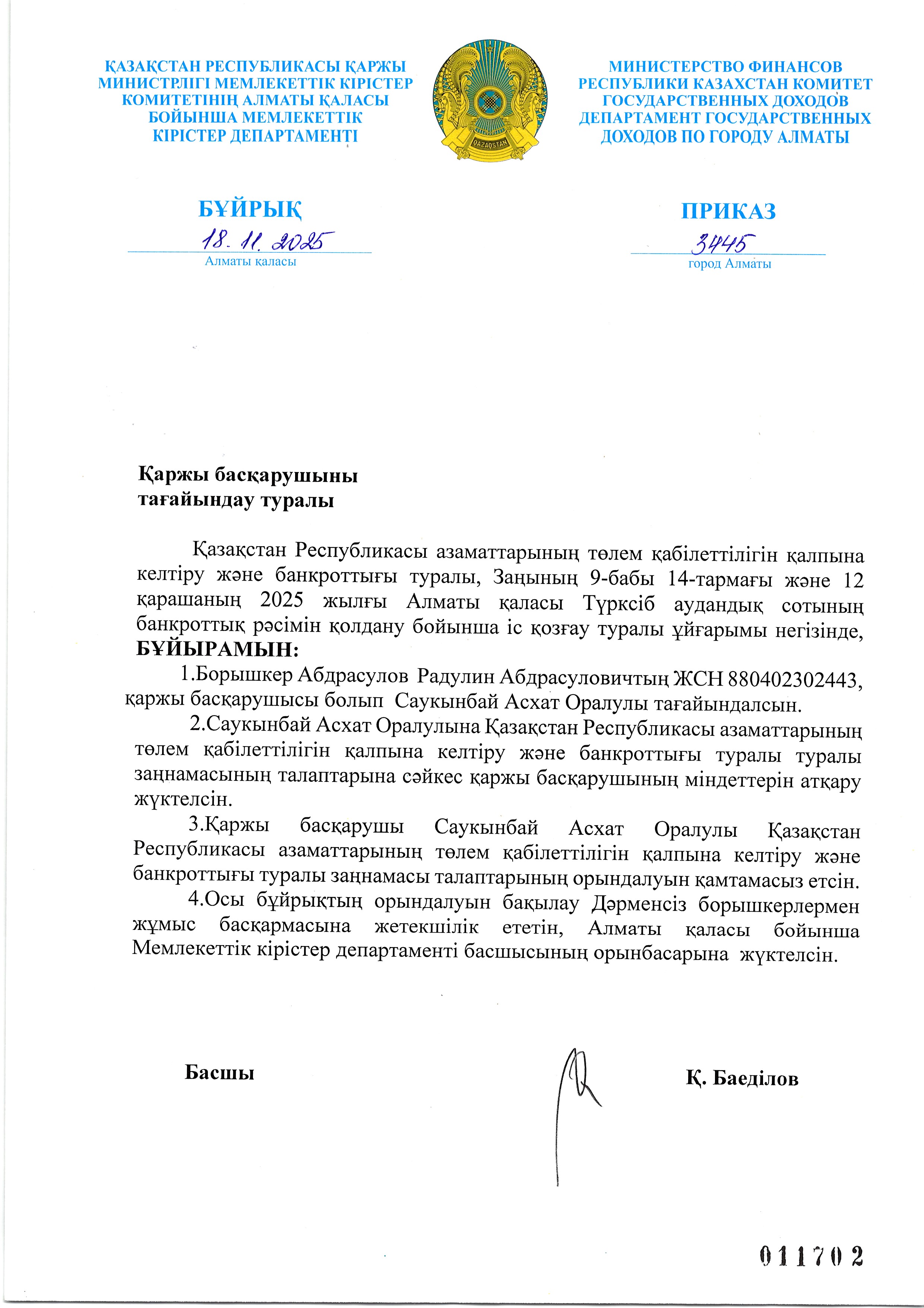 Абдрасулов Радулинның арызы бойынша қаржы басқарушыны тағайындау туралы бұйрық
