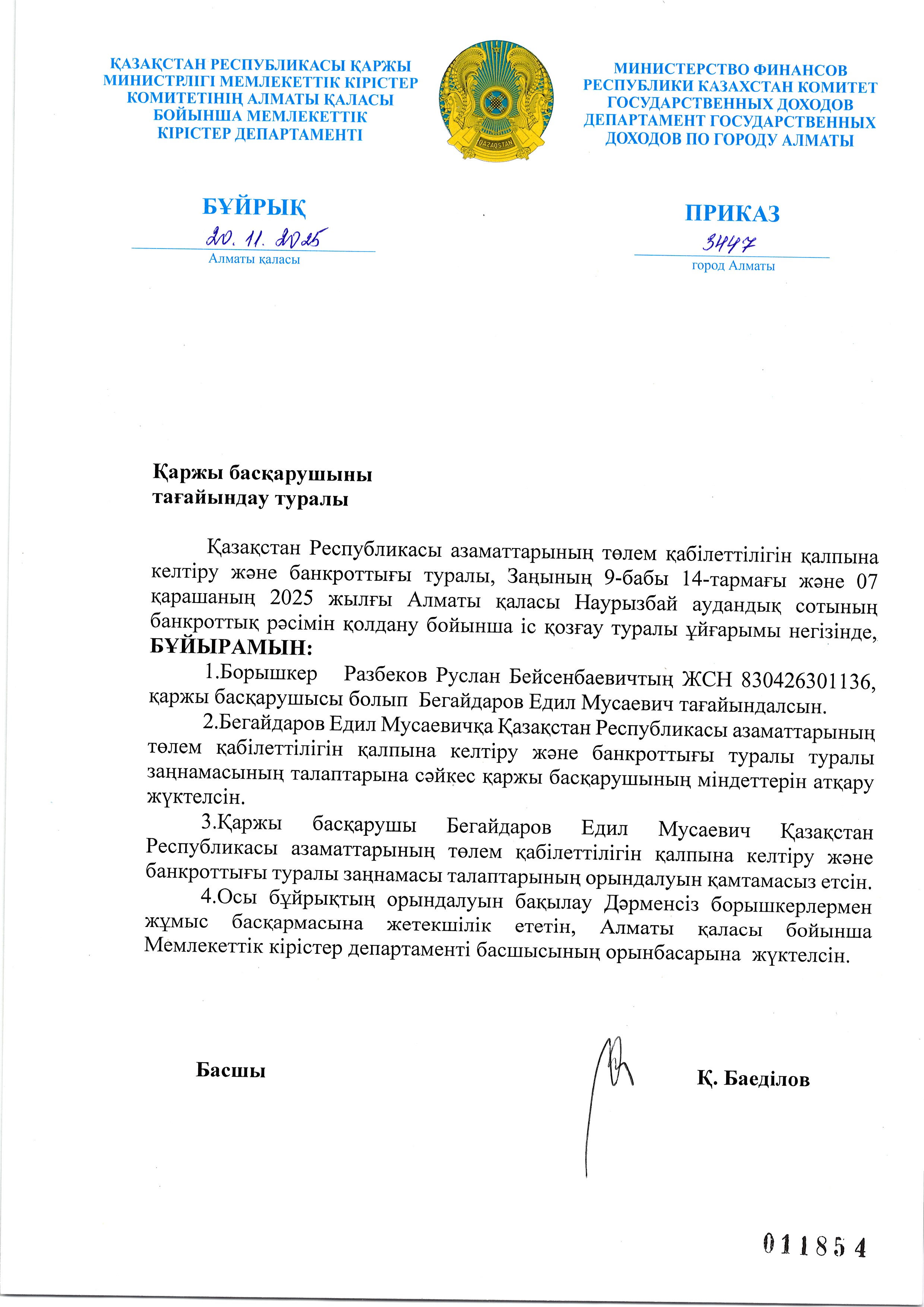 Разбеков Русланның арызы бойынша қаржы басқарушыны тағайындау туралы бұйрық