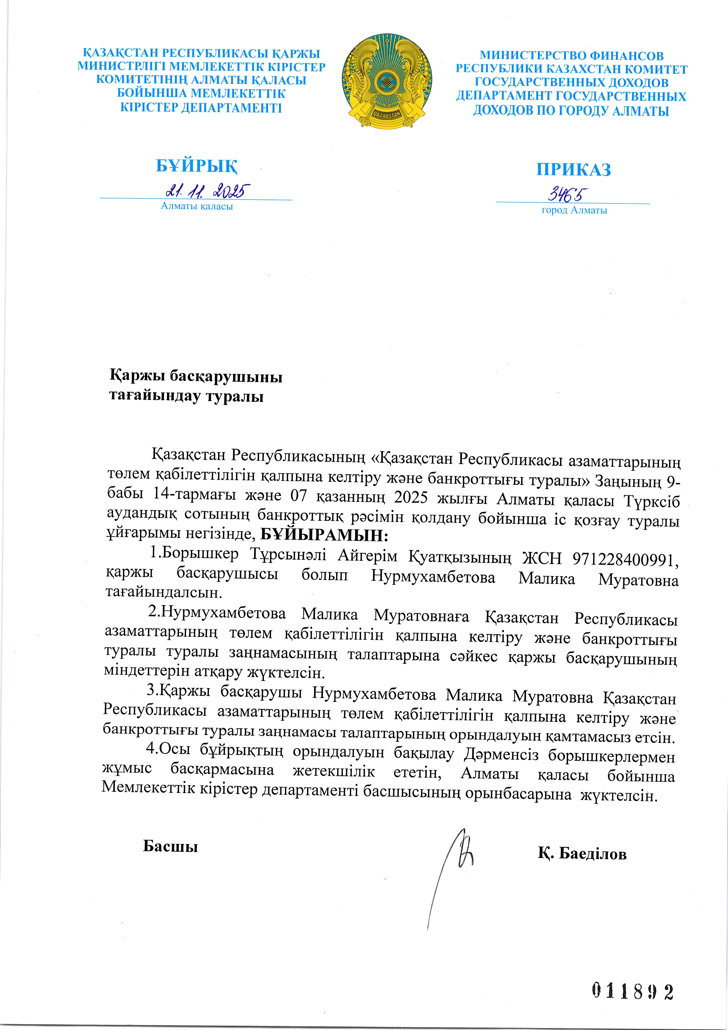 Тұрсынәлі Айгерімнің арызы бойынша қаржы басқарушыны тағайындау туралы бұйрық