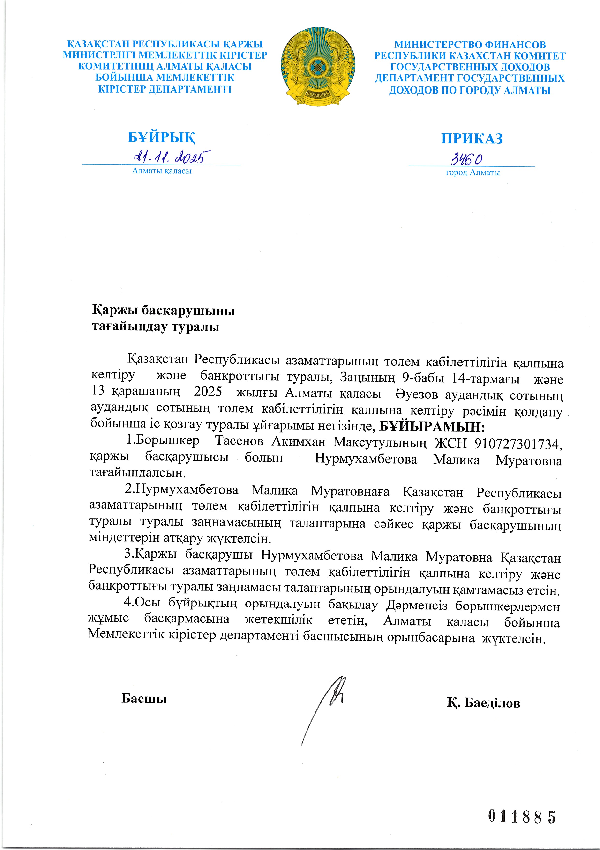 Тасенов Максаттың арызы бойынша қаржы басқарушыны тағайындау туралы бұйрық