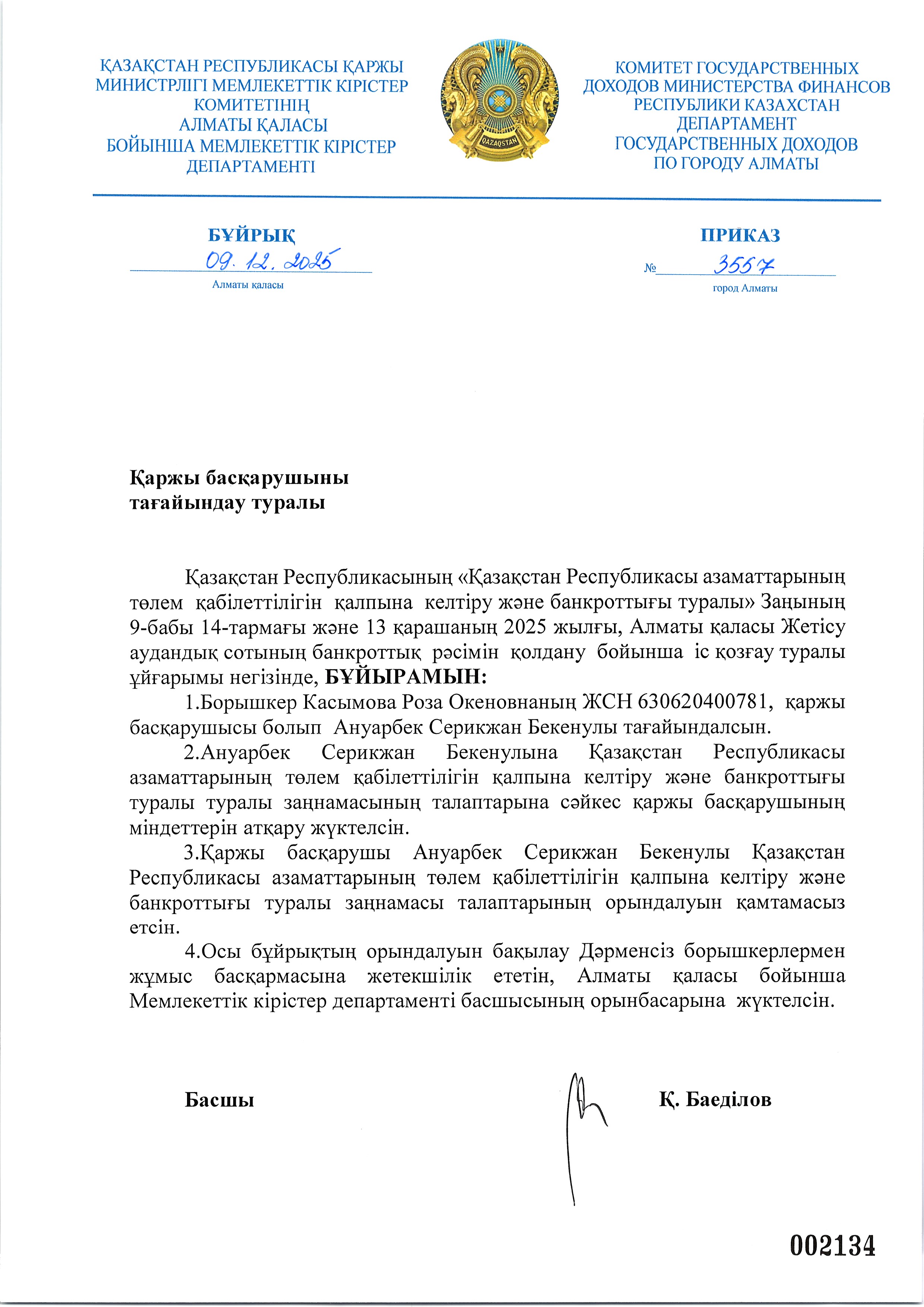Касымова Розаның арызы бойынша қаржы басқарушыны тағайындау туралы бұйрық