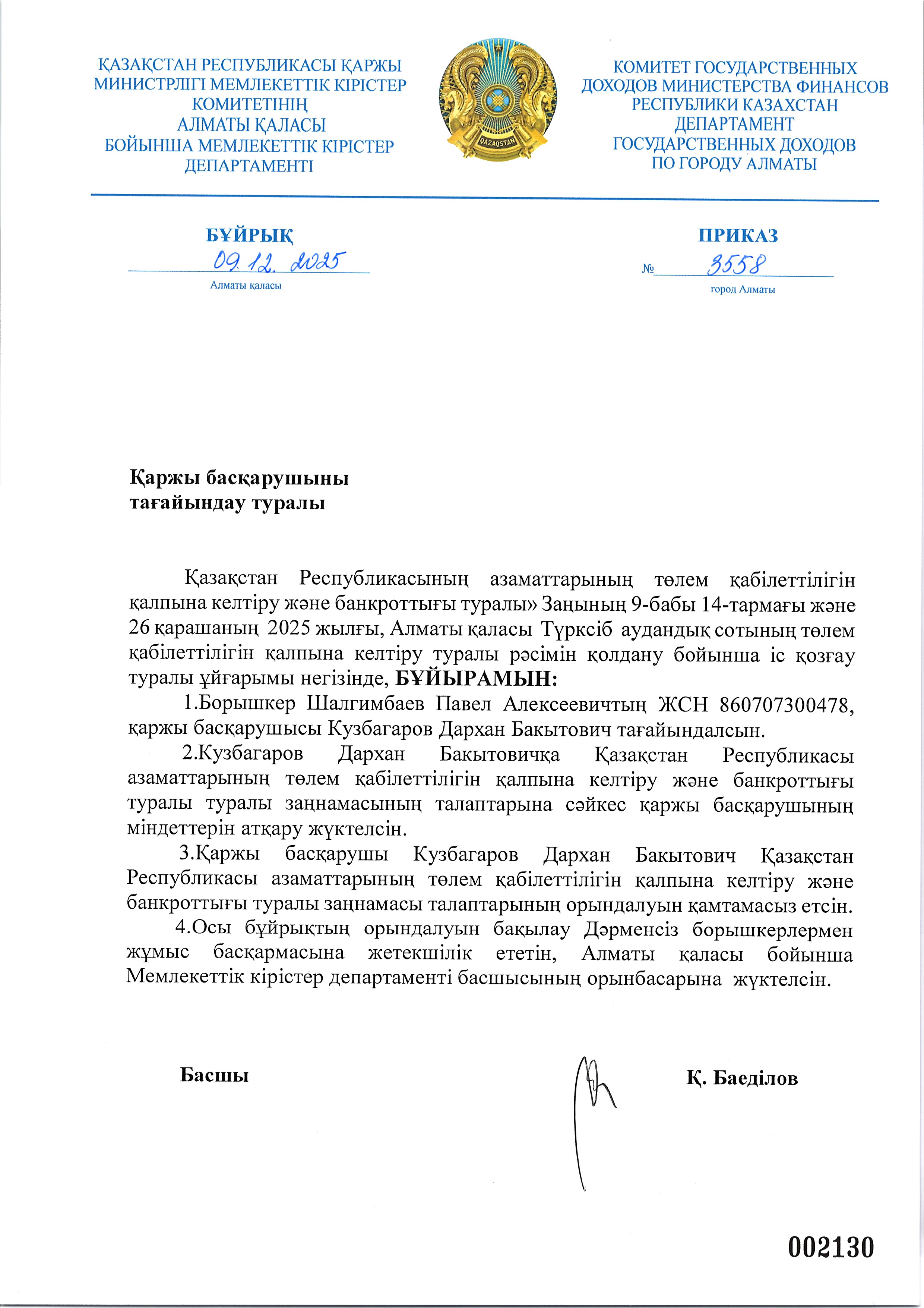 Шалгимаев Павелдің арызы бойынша қаржы басқарушыны тағайындау туралы бұйрық