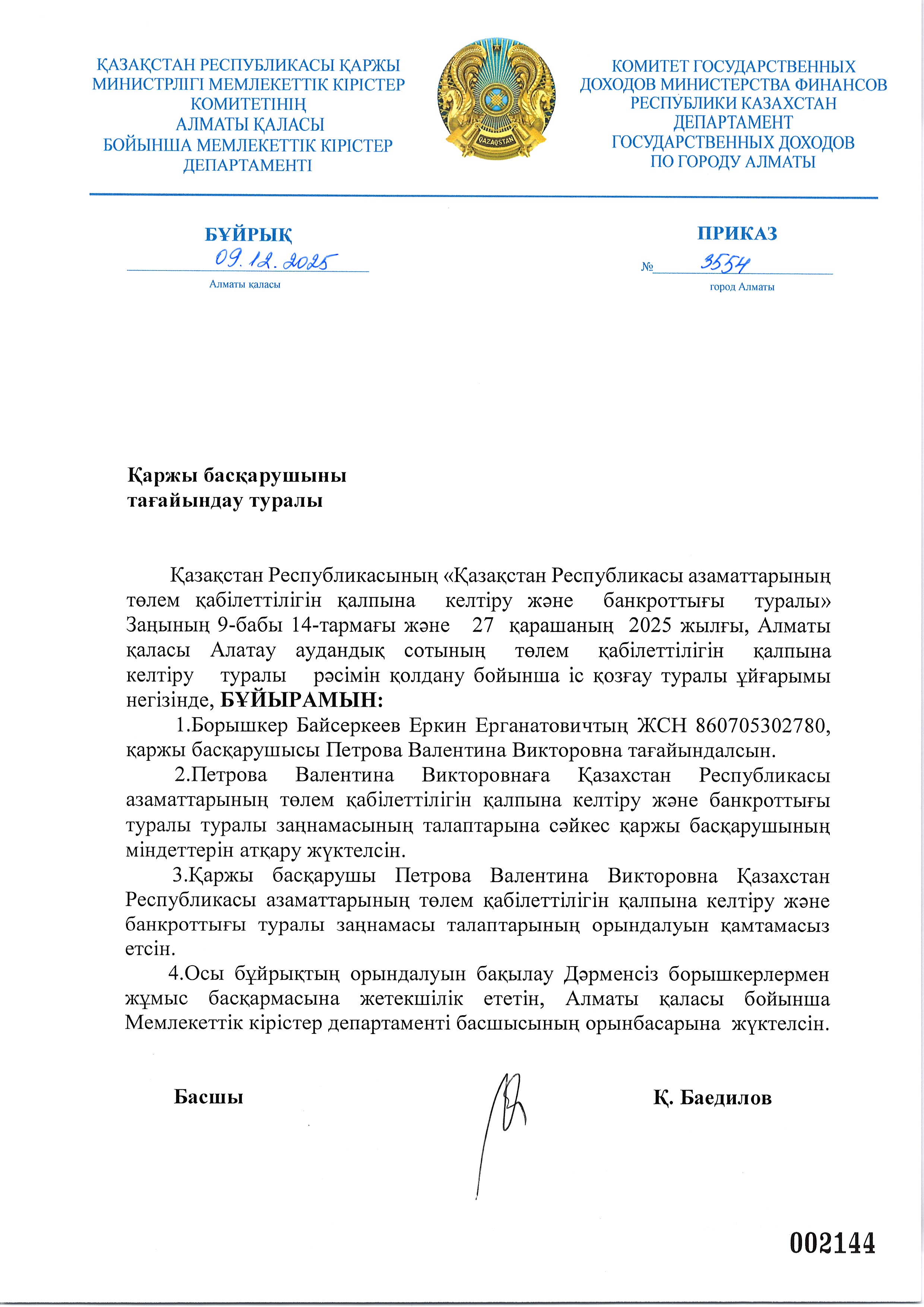 Байсеркеев Еркинің арызы бойынша қаржы басқарушыны тағайындау туралы бұйрық