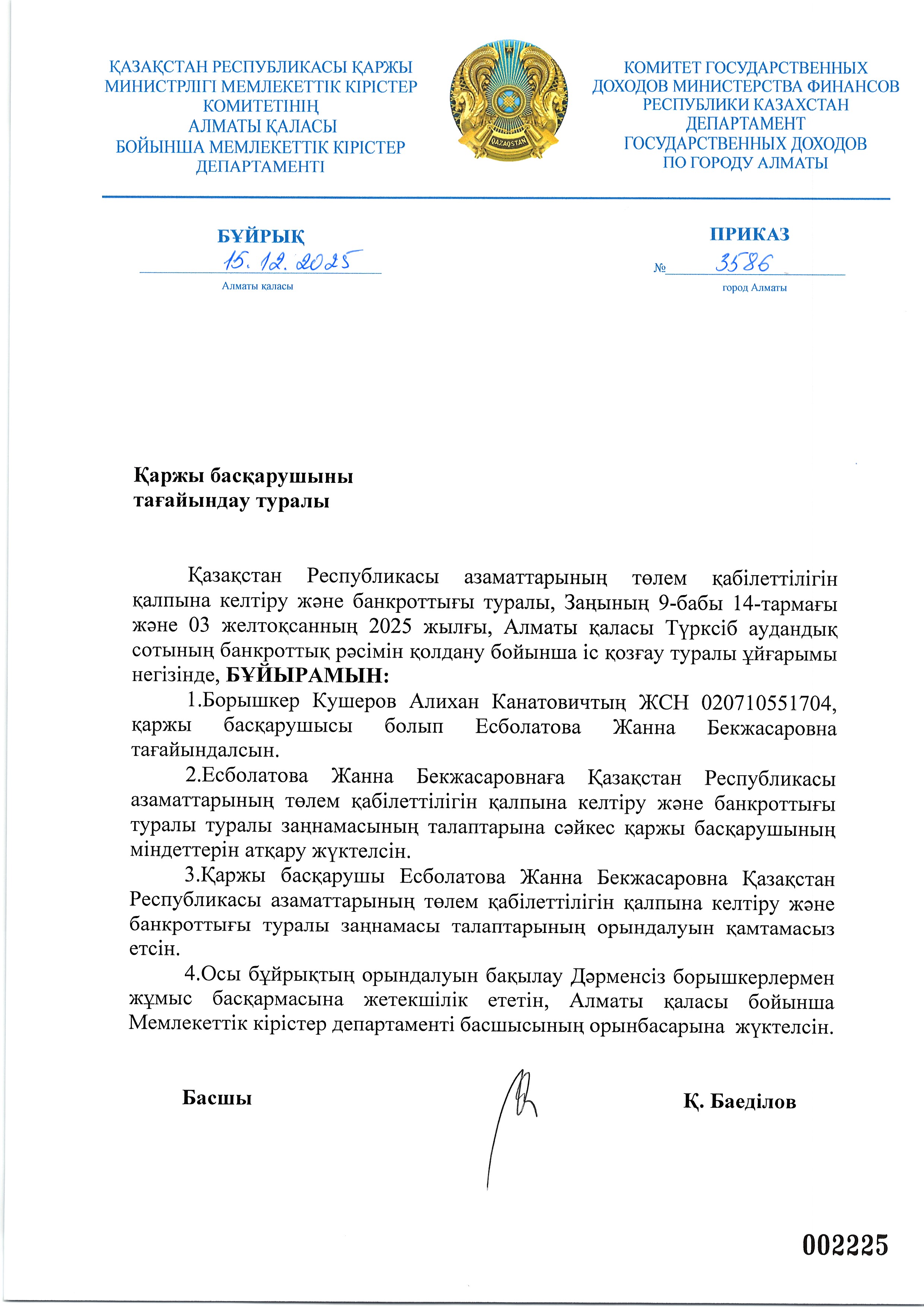 Кушеров Алиханнің арызы бойынша қаржы басқарушыны тағайындау туралы бұйрық