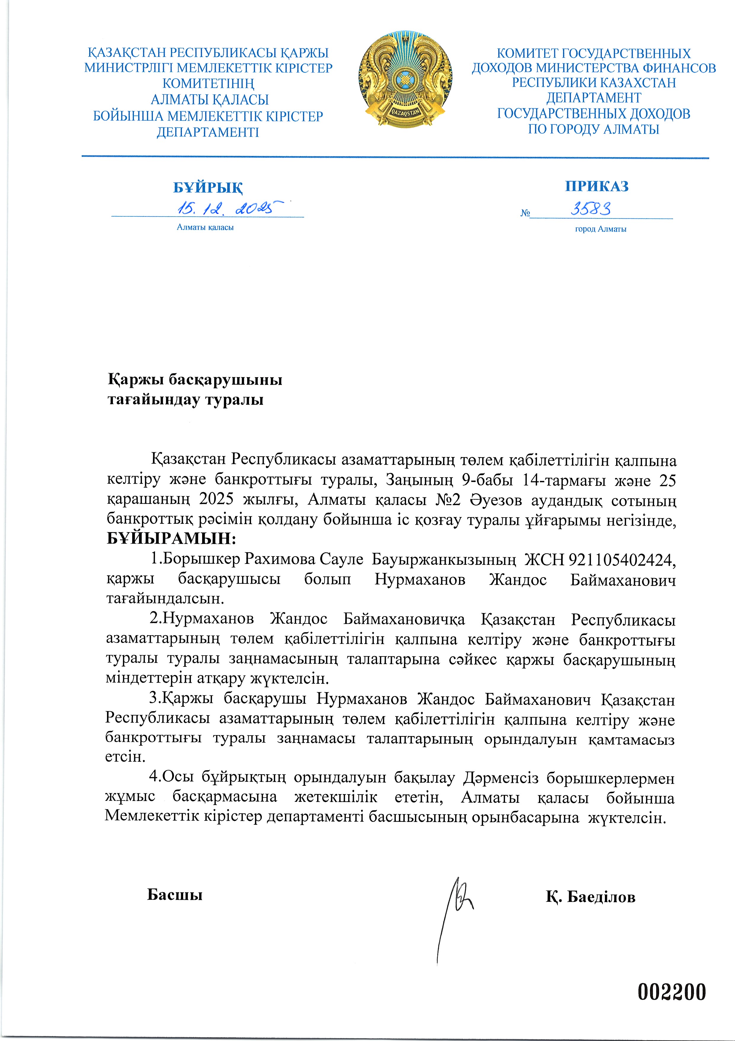 Рахимова Сауленің арызы бойынша қаржы басқарушыны тағайындау туралы бұйрық