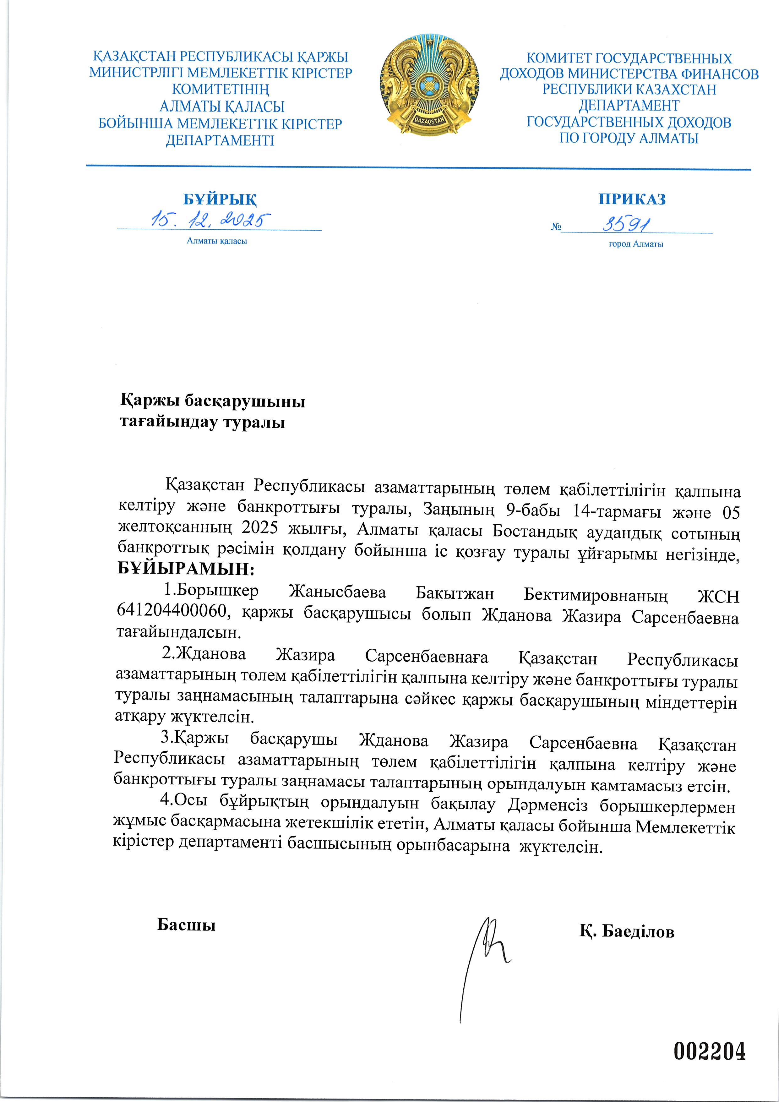 Жанысбаев Бакытжанің арызы бойынша қаржы басқарушыны тағайындау туралы бұйрық