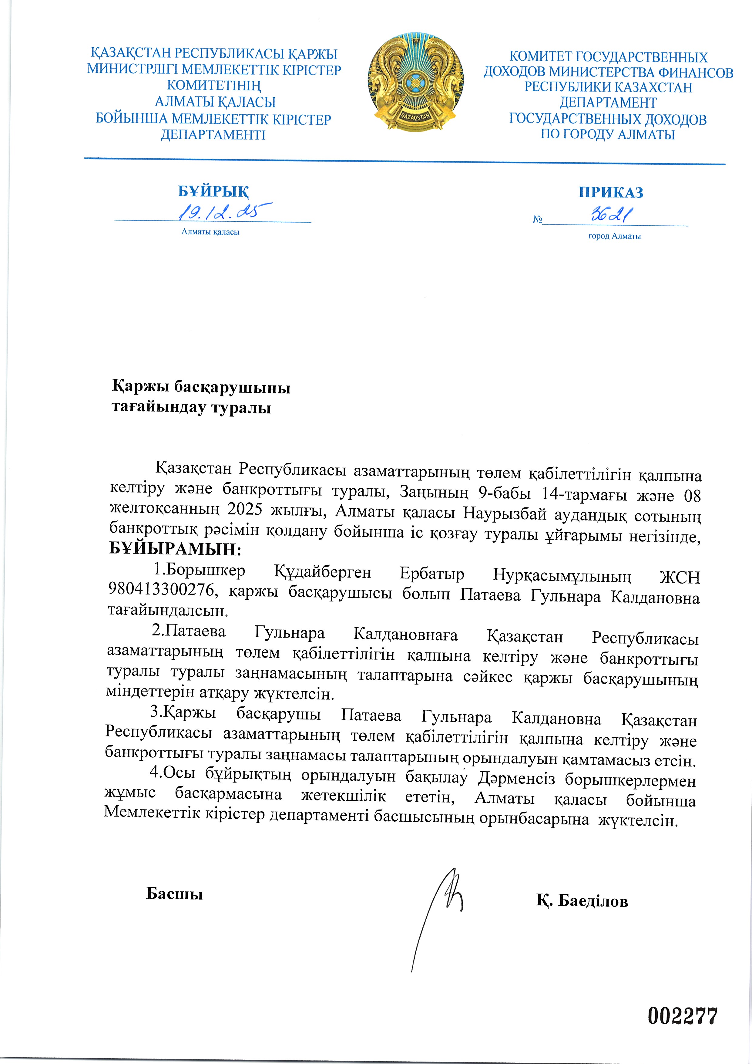 Құдайберген Ербатырдің арызы бойынша қаржы басқарушыны тағайындау туралы бұйрық