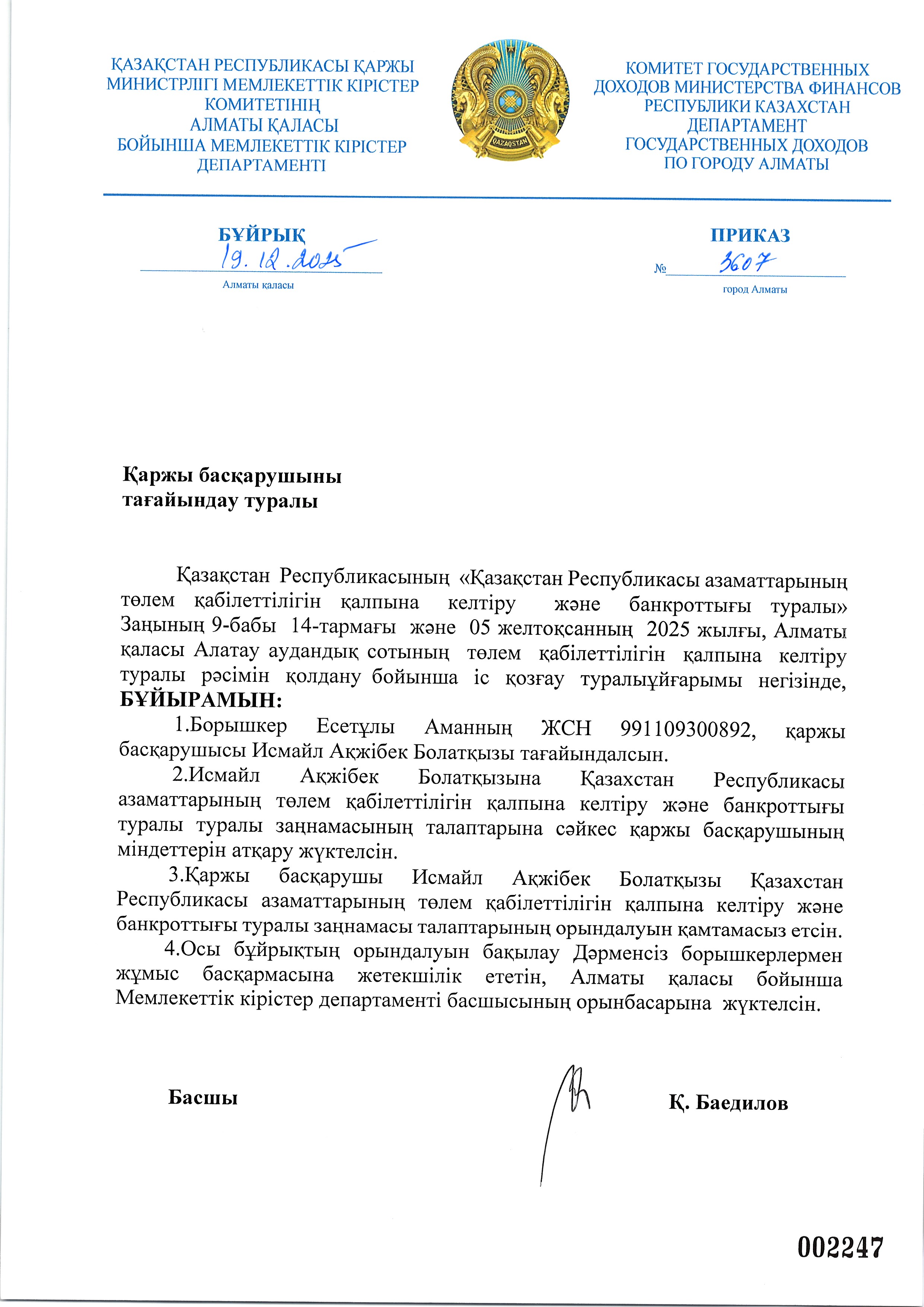 Есетұлы Аманның арызы бойынша қаржы басқарушыны тағайындау туралы бұйрық