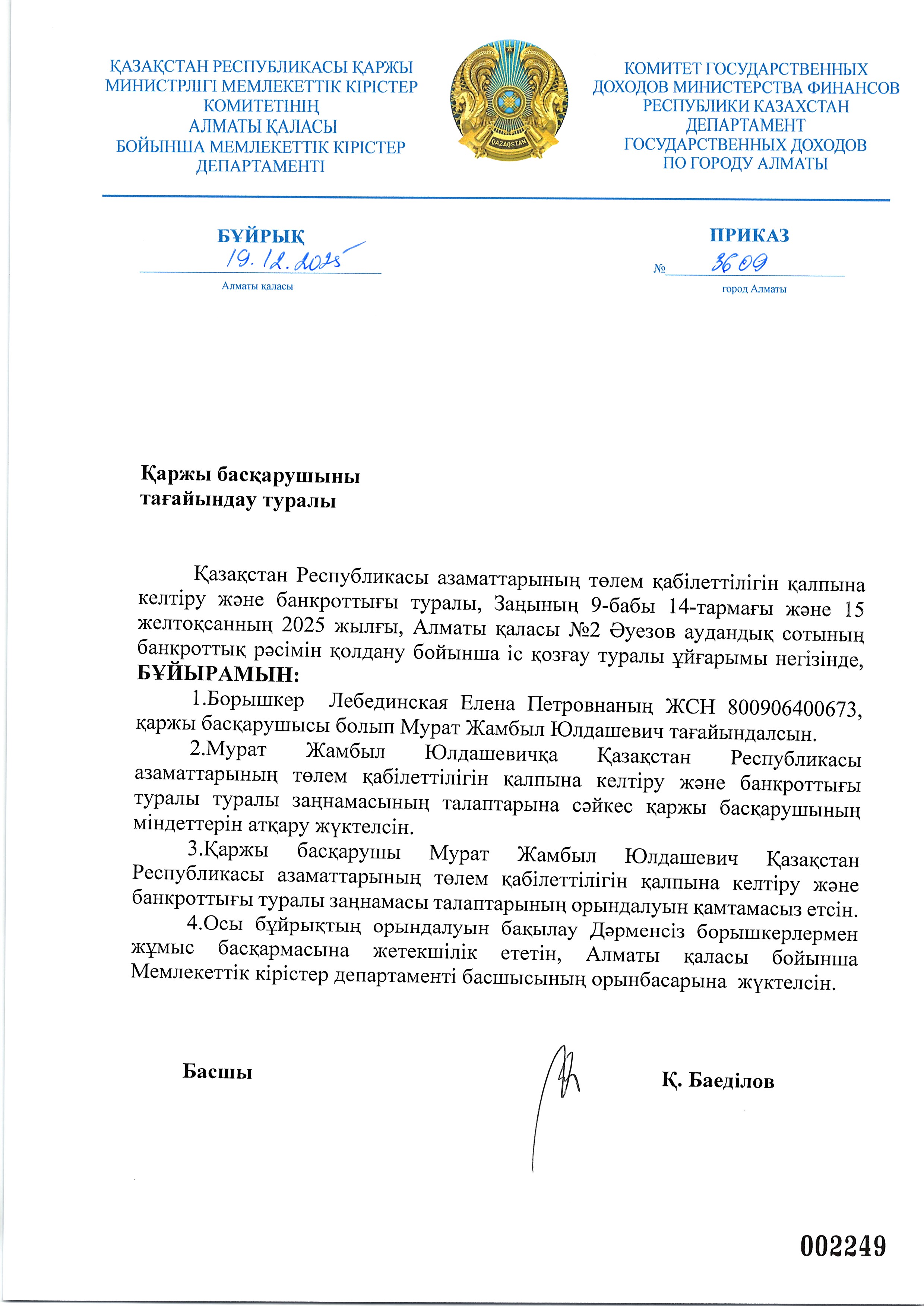 Лебедеинская Еленаның арызы бойынша қаржы басқарушыны тағайындау туралы бұйрық
