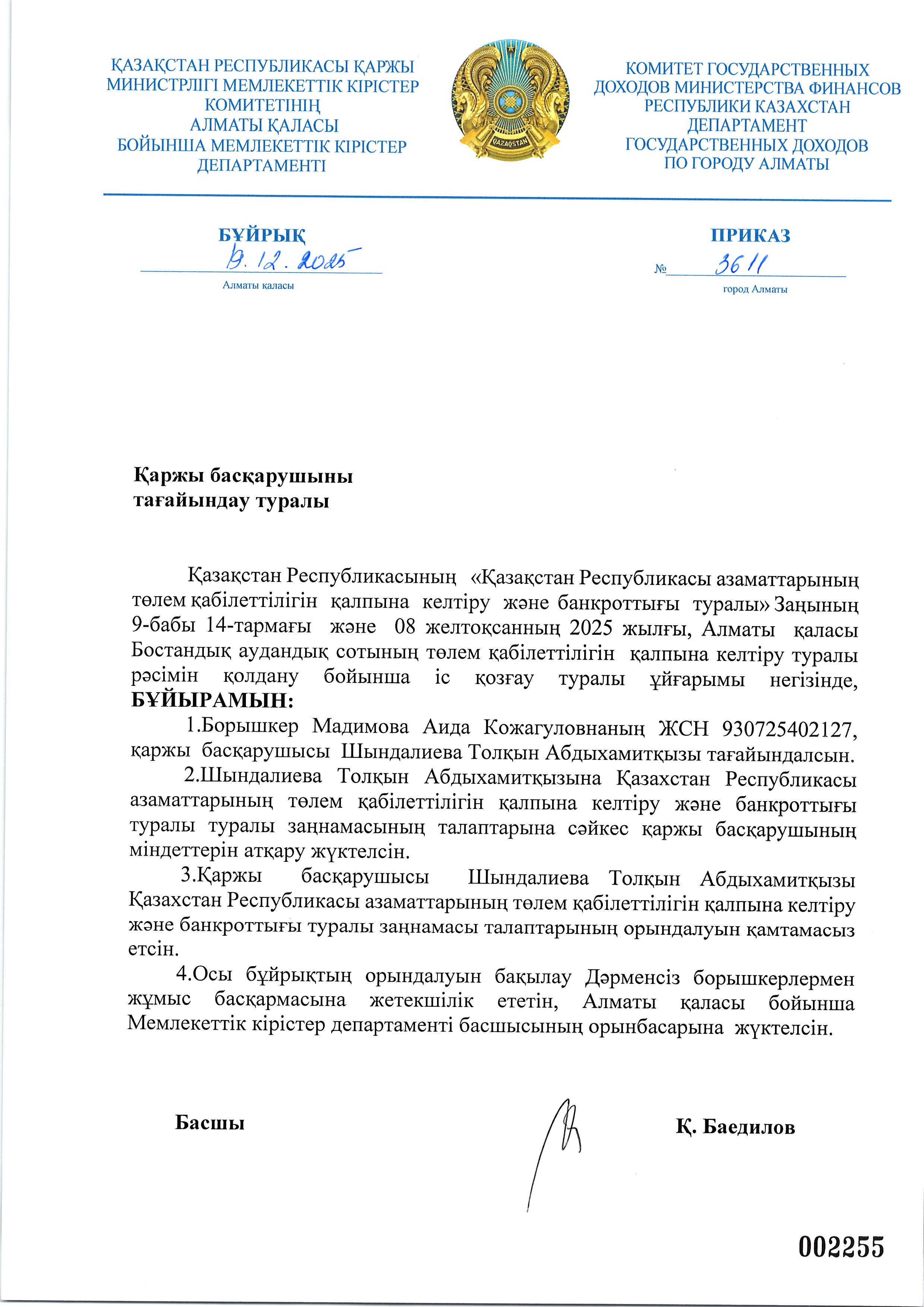 Мадимова Аиданың арызы бойынша қаржы басқарушыны тағайындау туралы бұйрық
