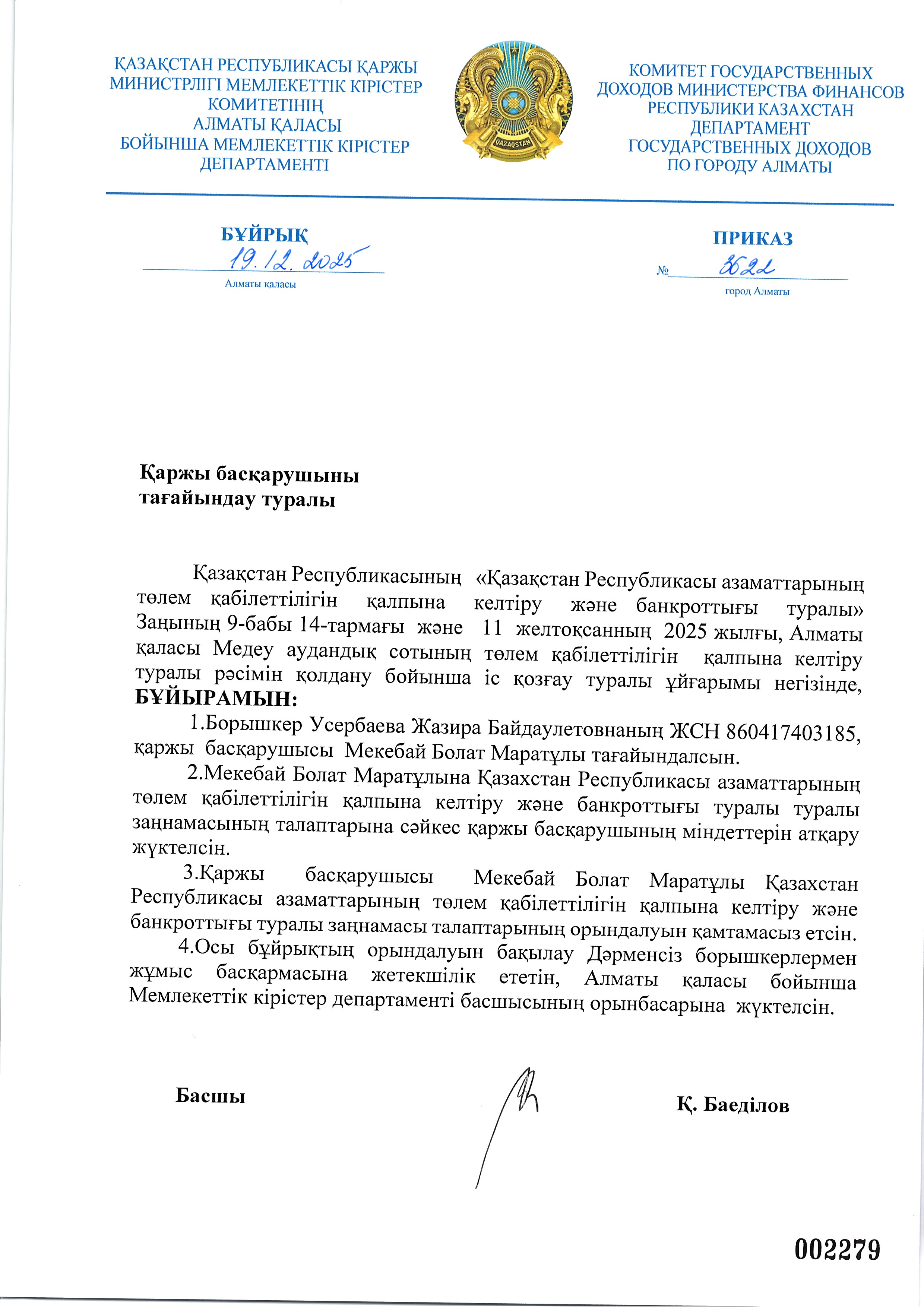 Усербаева Жазираның арызы бойынша қаржы басқарушыны тағайындау туралы бұйрық
