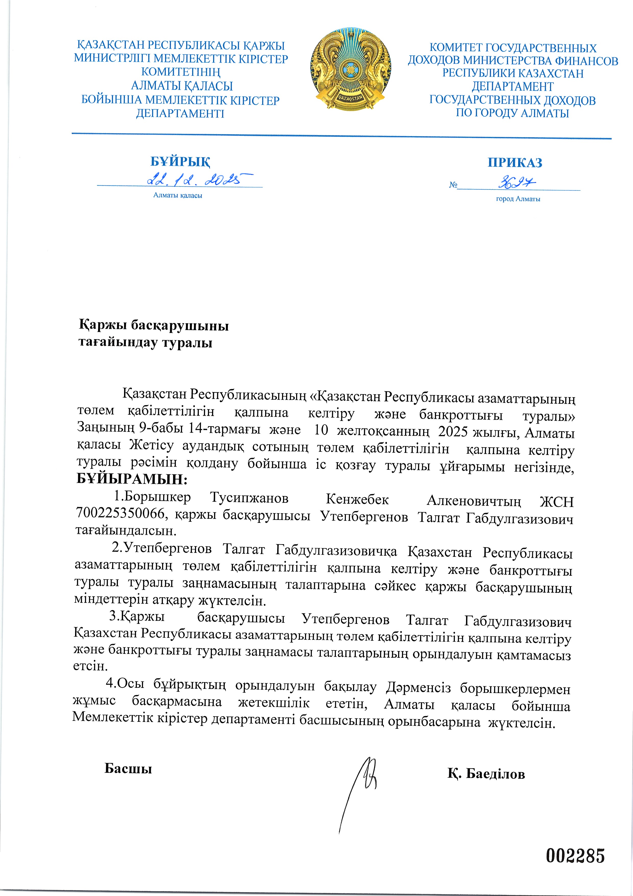 Тусипжанов Кенжебектің арызы бойынша қаржы басқарушыны тағайындау туралы бұйрық