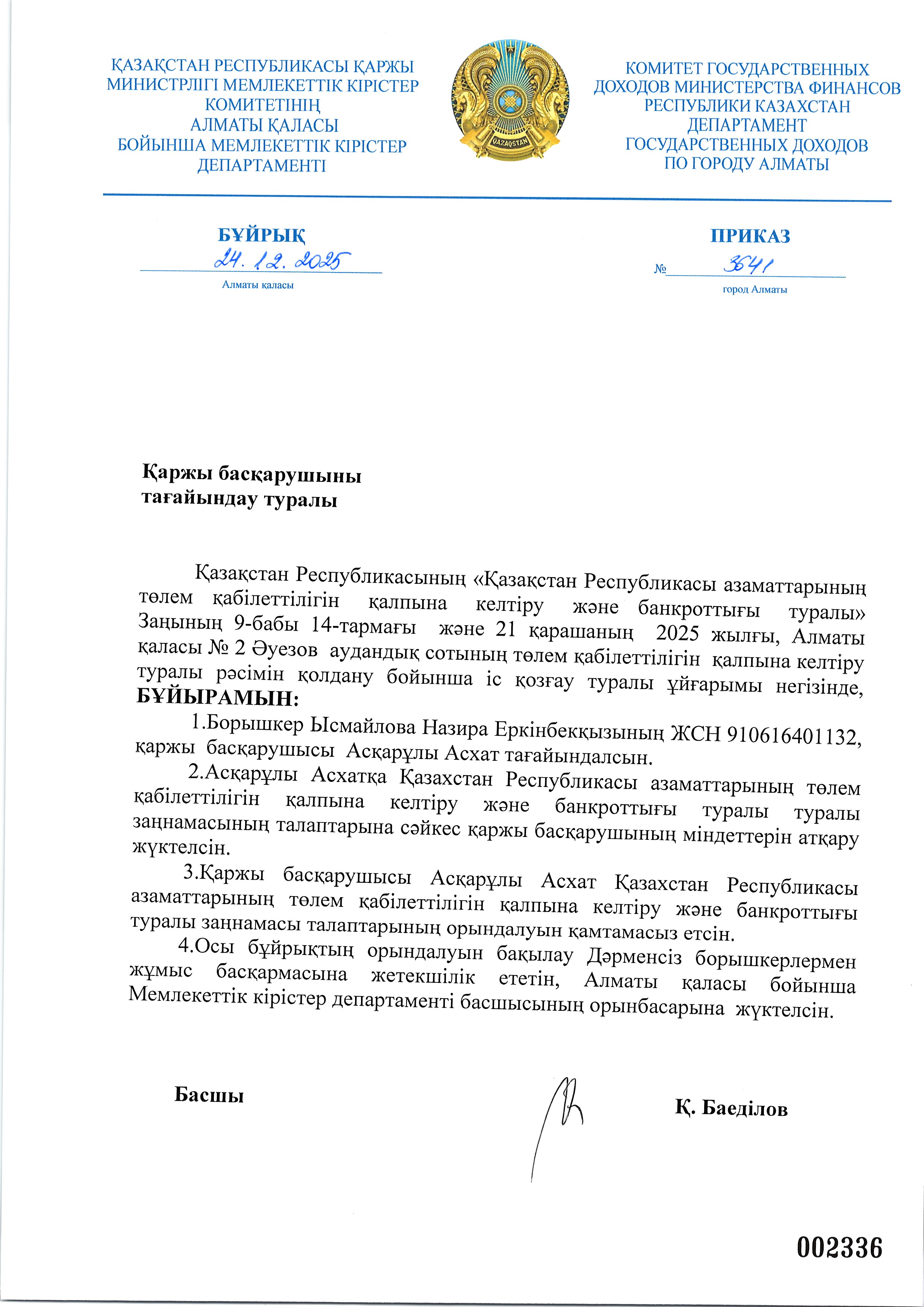 Ысмайлова Назираның арызы бойынша қаржы басқарушыны тағайындау туралы бұйрық
