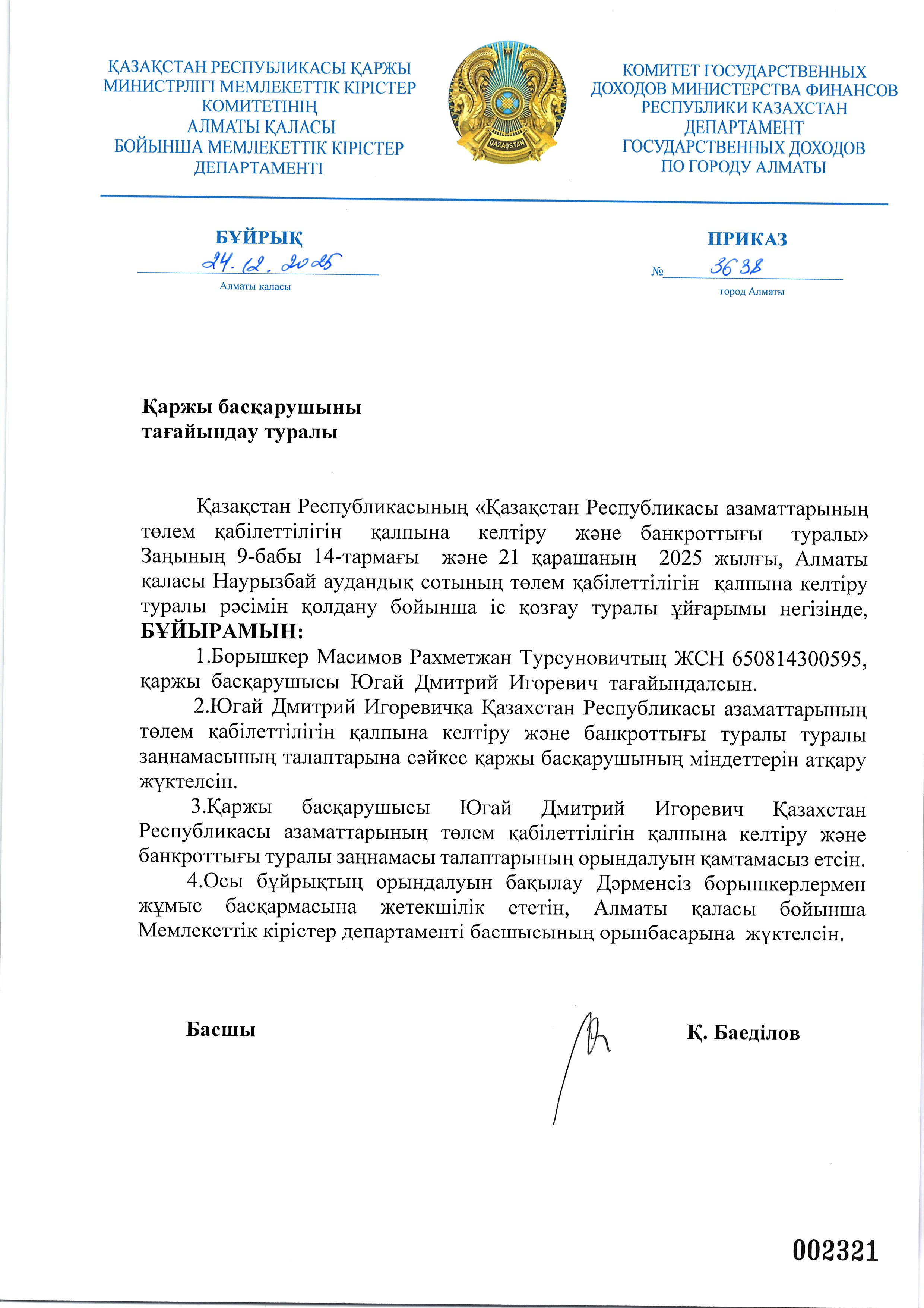 Масимов Рахметжаннің арызы бойынша қаржы басқарушыны тағайындау туралы бұйрық