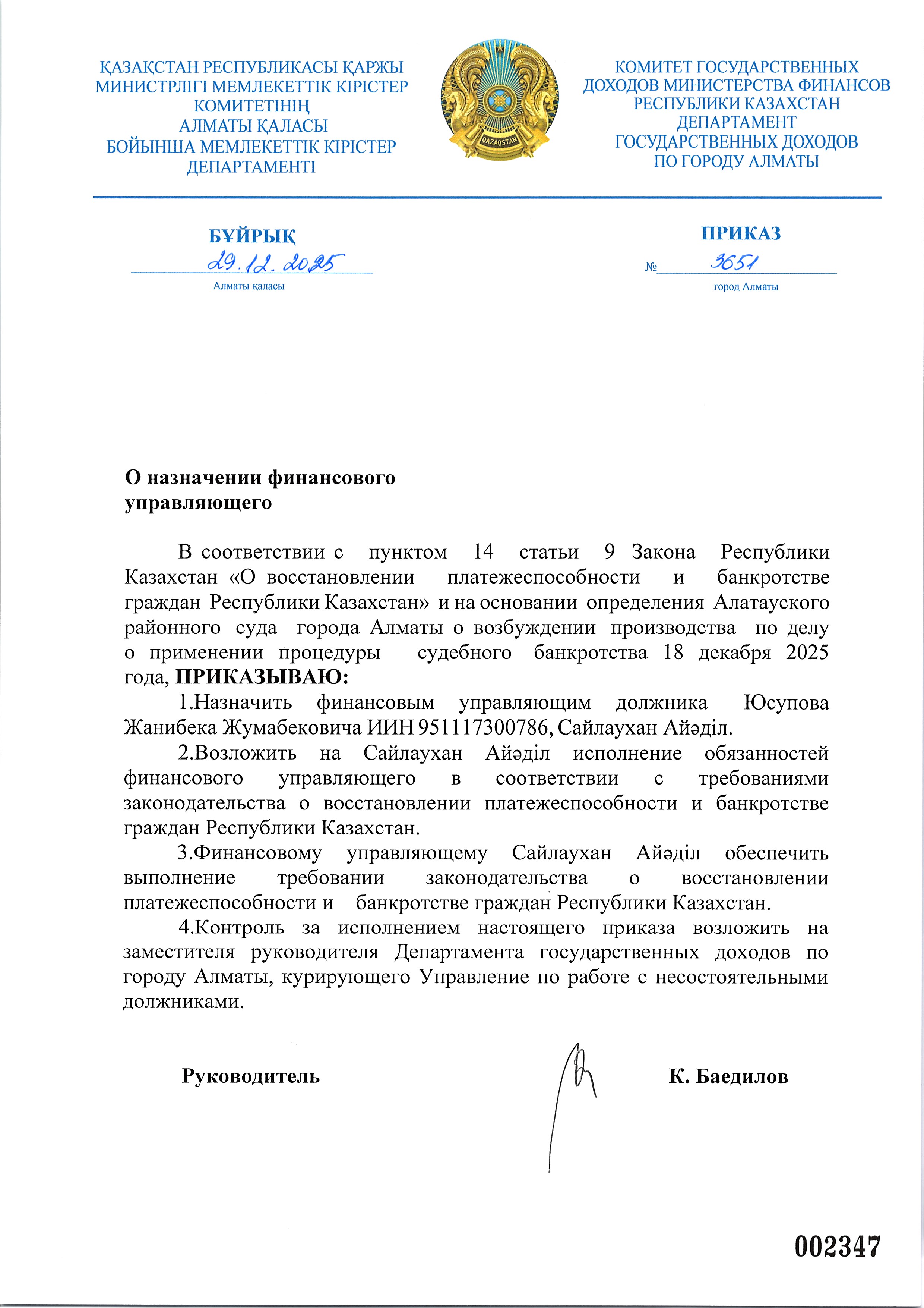 Приказ о назначении финансового управляющего по заявлению должника Юсупов Жанибек