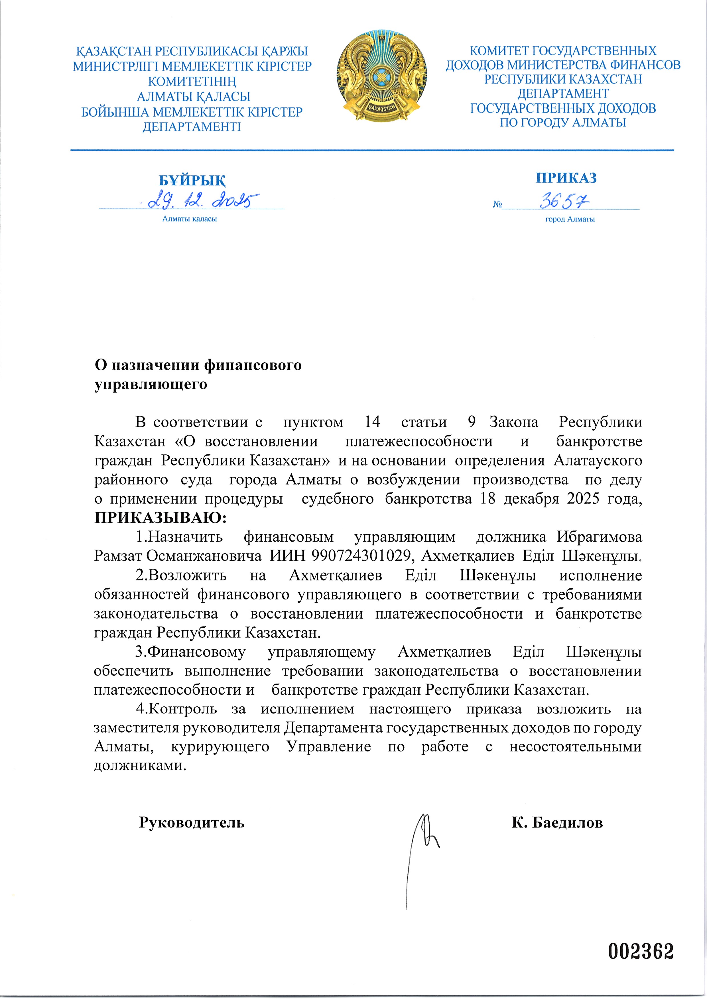 Приказ о назначении финансового управляющего по заявлению должника Ибрагимов Рамзат