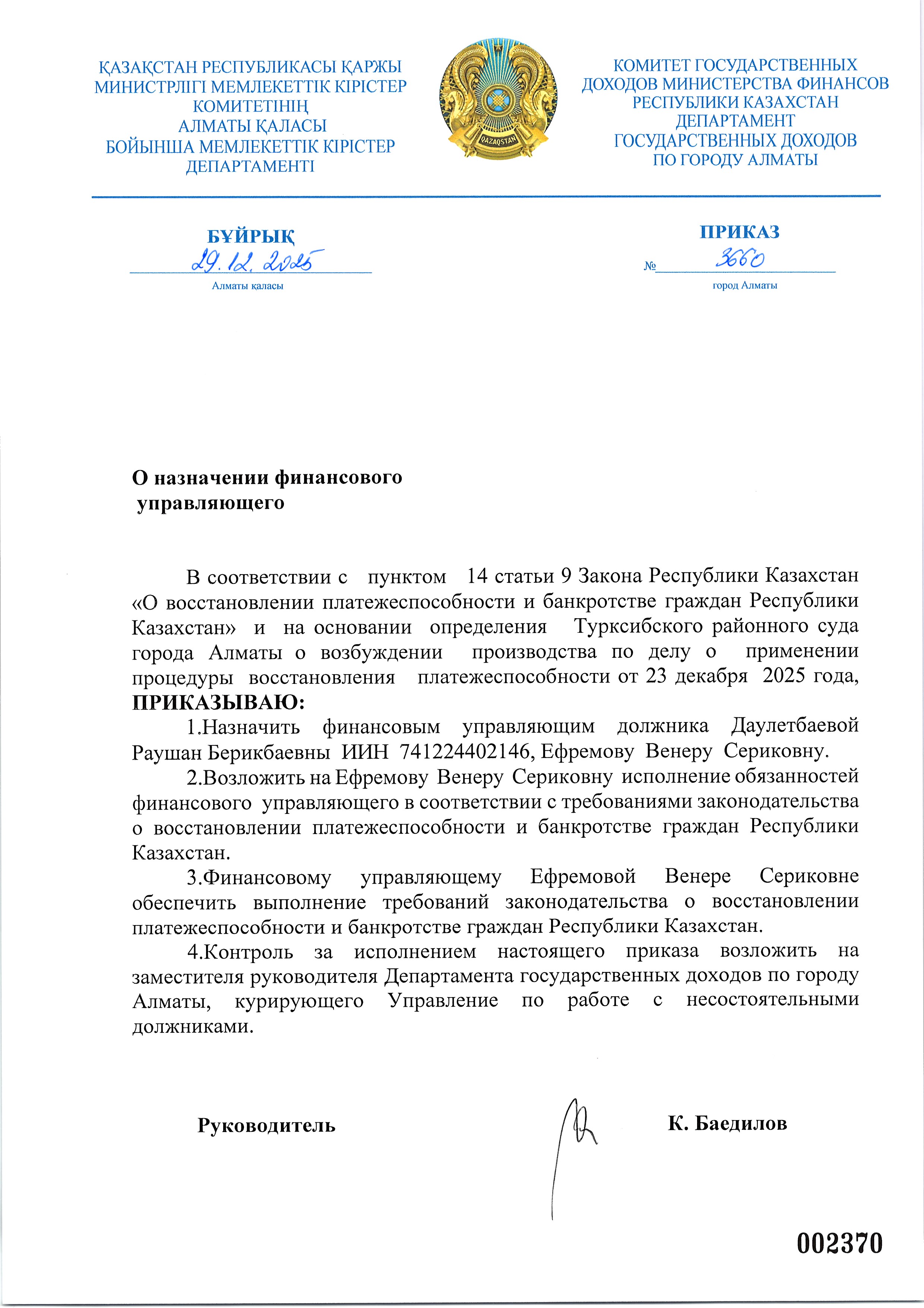 Приказ о назначении финансового управляющего по заявлению должника Даулетбаева Раушан Берикбаевна