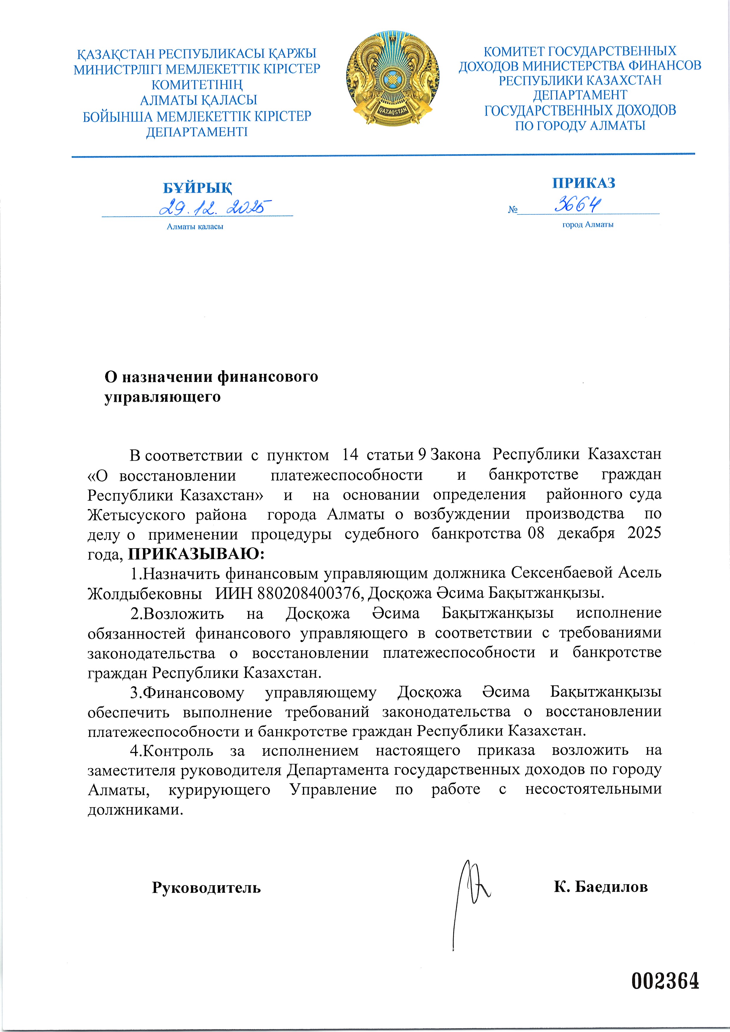 Приказ о назначении финансового управляющего по заявлению должника Сексенбаева Асель