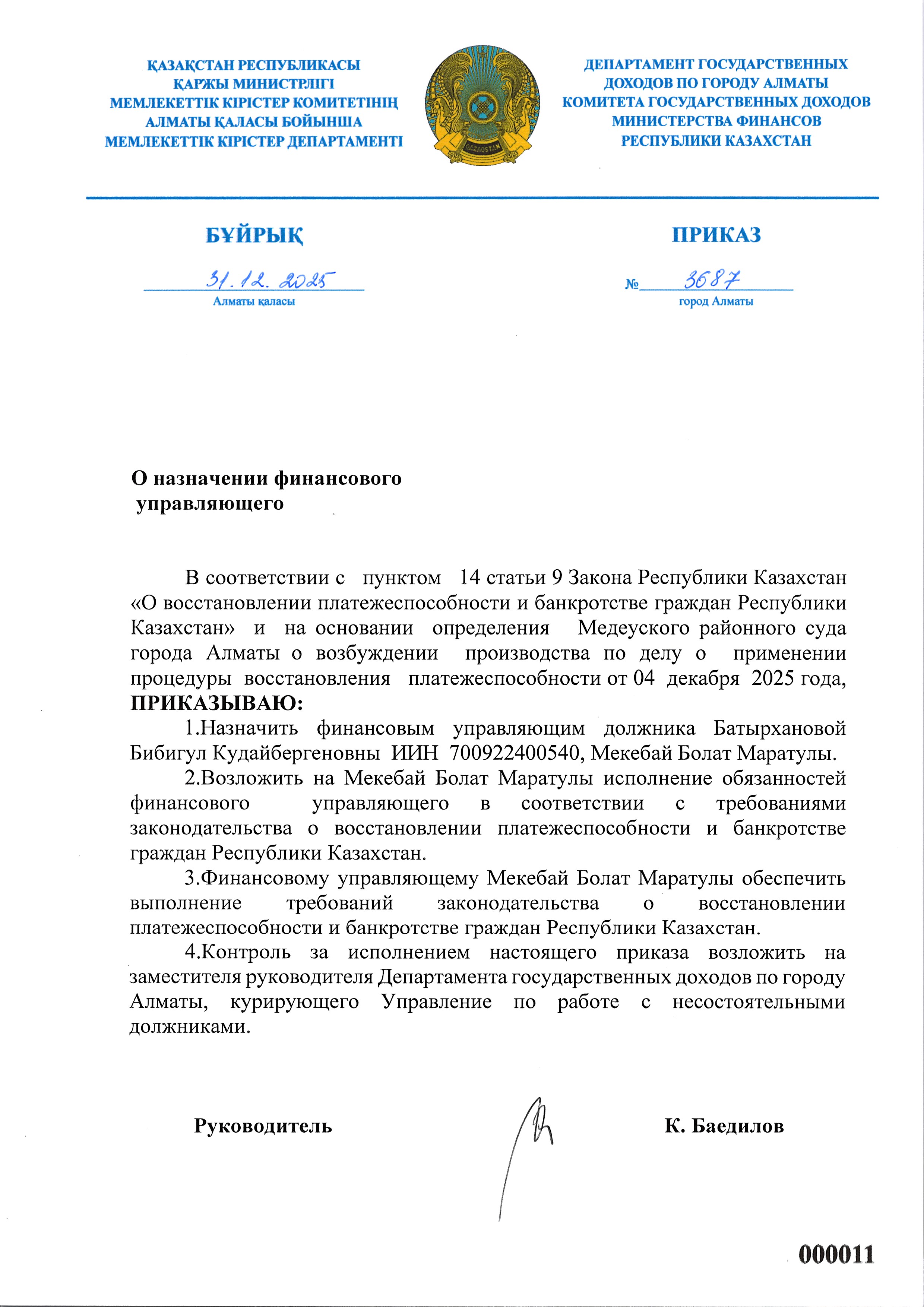 Приказ о назначении финансового управляющего по заявлению должника Батырханова Бибигул
