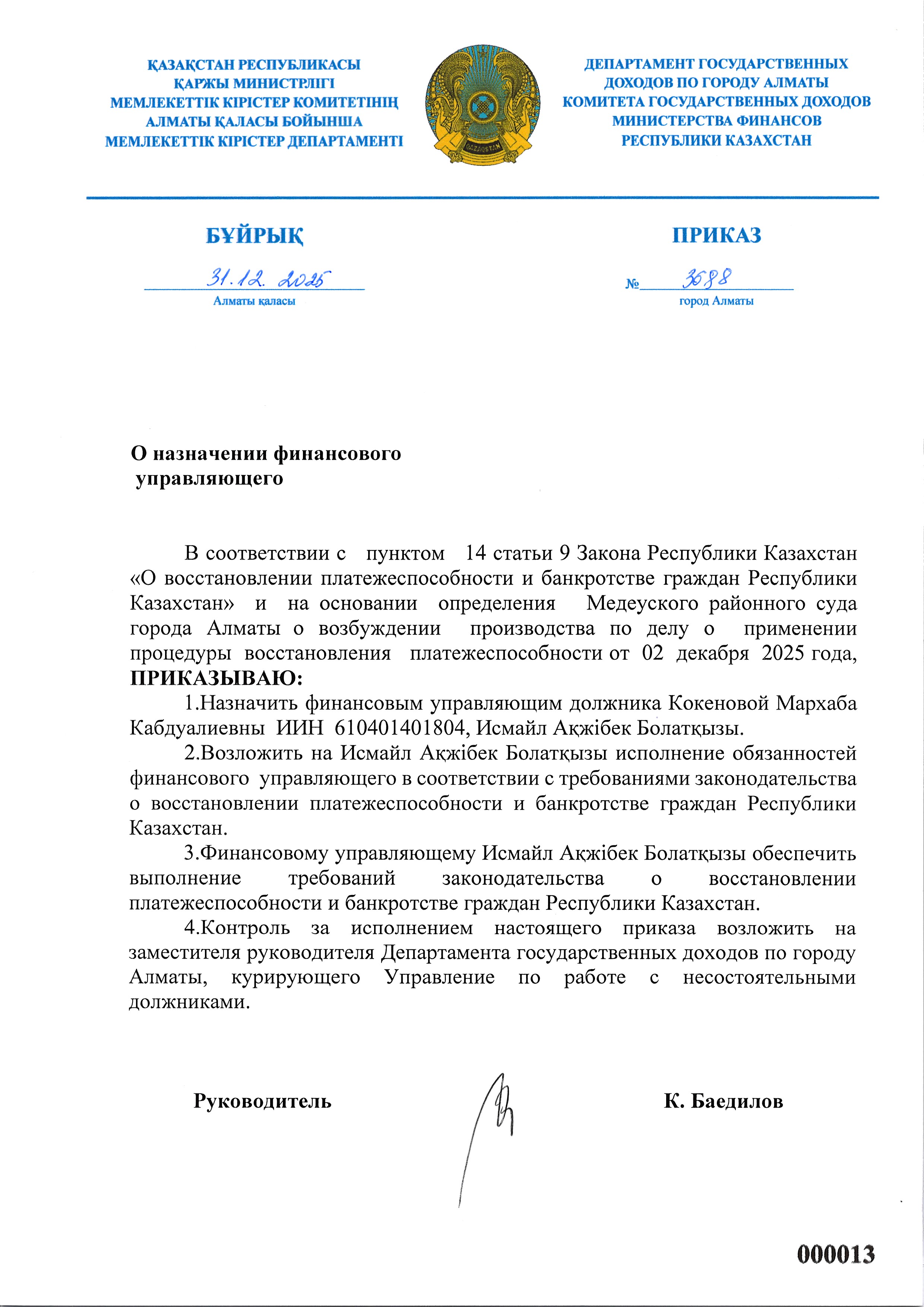 Приказ о назначении финансового управляющего по заявлению должника Кокенова Мархаба
